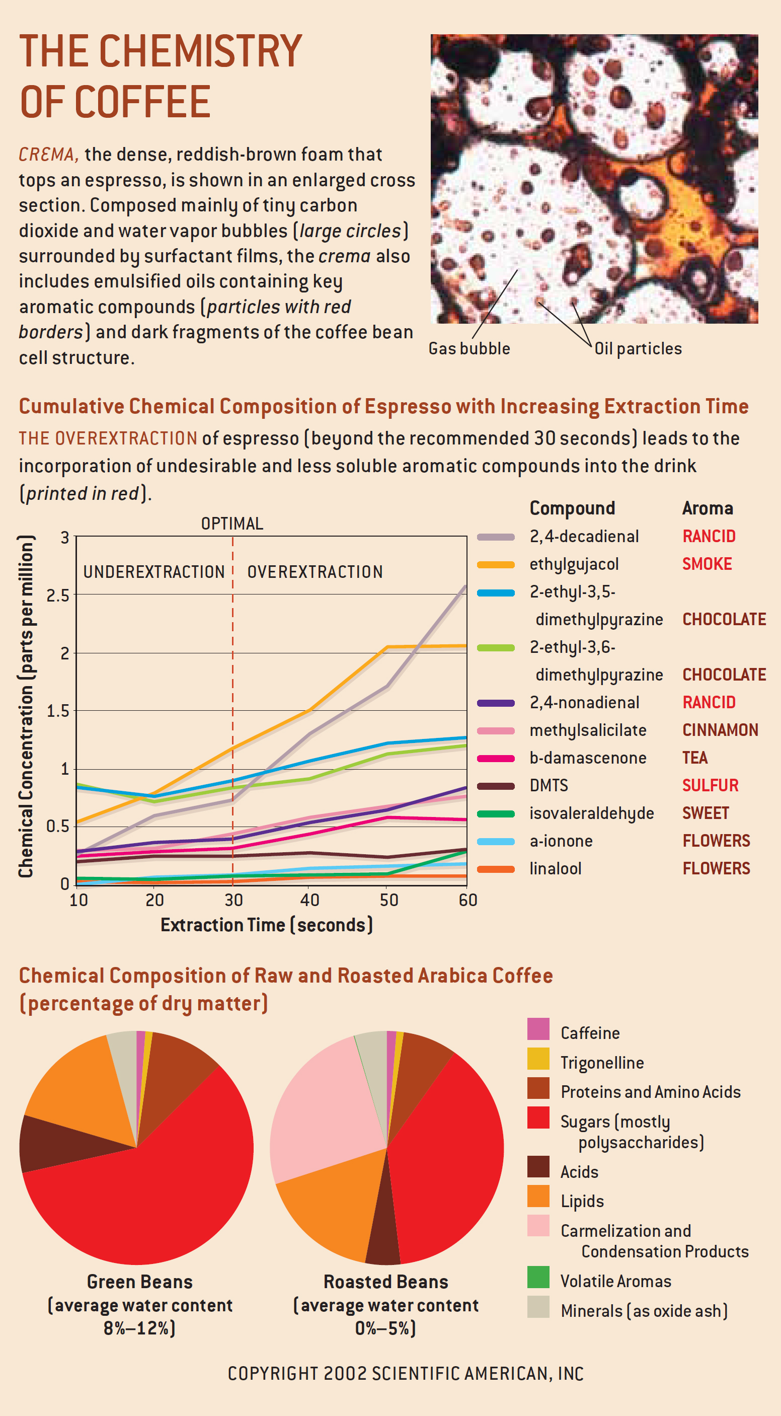순수한 감각적 즐거움을 위해, 좋은 커피 한 잔만큼 일상적인 경험은 거의 없을 것이다. 갓 볶은 원두에서 방금 내린 따뜻한 커피의 매혹적인 향은 잠자는 사람을 침대에서 끌어내고 보행자를 카페로 끌어들일 수 있다. 그리고 전세계 수백만 명의 사람들이 커피에 함유된 카페인이 주는 정신적 명료의 충격 없이는 하루를 보내는 것이 어렵다고 생각할 것이다. 하지만 이 평범해 보이는 음료의 근저에는 심오한 화학적 복잡성(chemical complexity)이 있다. 생두 생산, 로스팅 및 마련의 예상 밖의 변화(vagaries)가 커피의 플레이버, 아로마 및 바디를 정의하는 수백 가지 화합물에 어떻게 미세하게 영향을 미치는지에 대한 깊은 이해가 없다면, 양질의 커피 한 잔은 드물고 무작위적인 일이 될 것이다.
