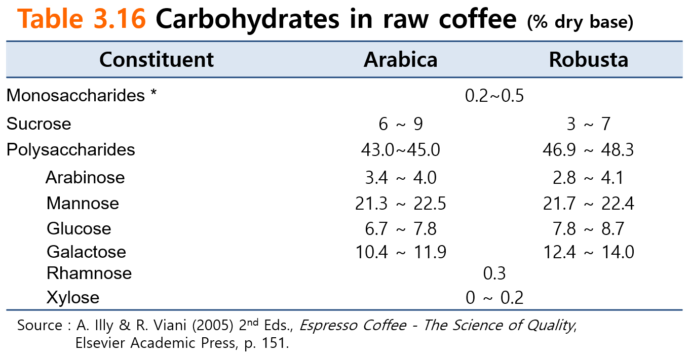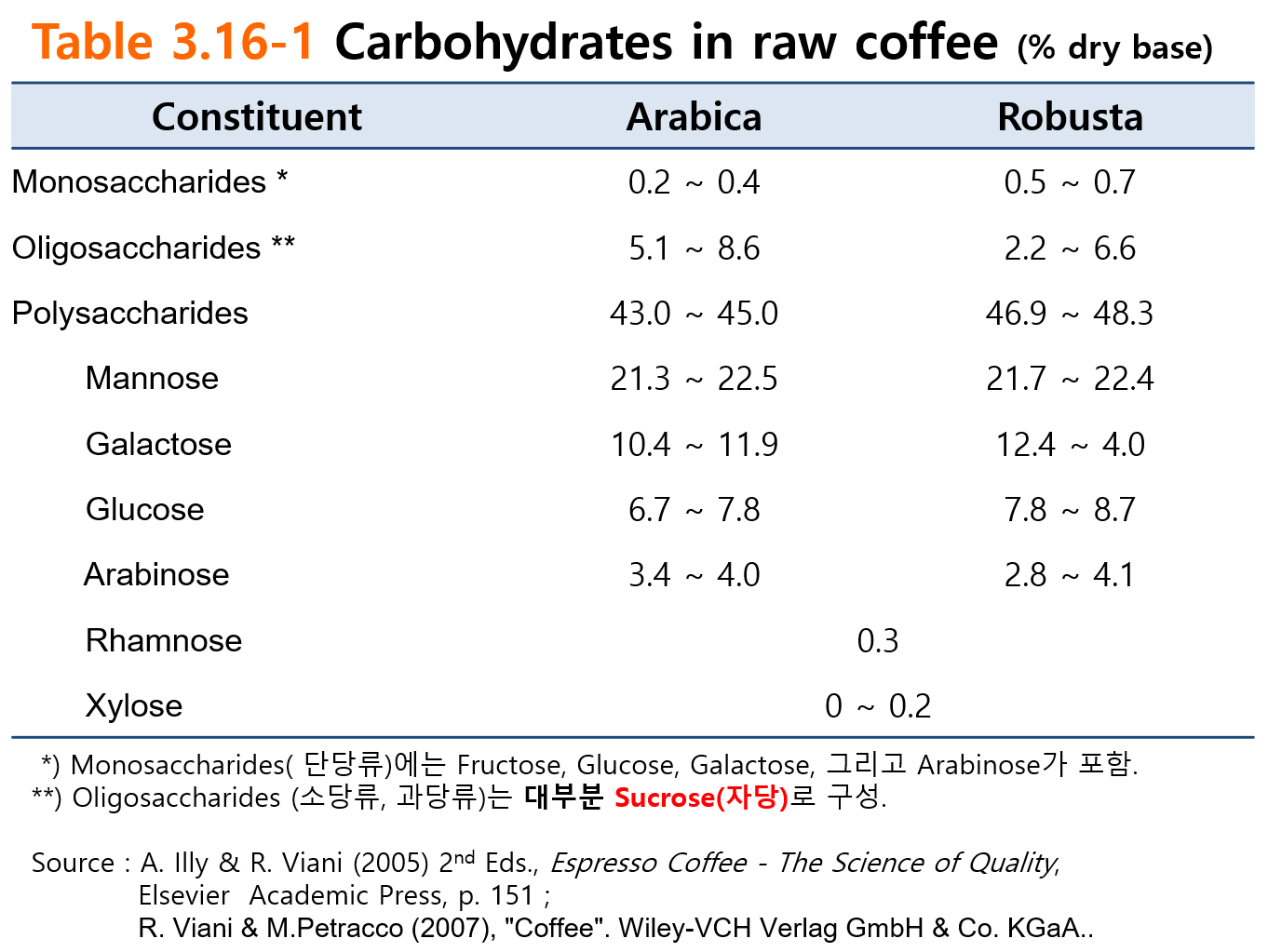 - Total amount of carbohydrates (커피 생두의 탄수화물 총량)은 무수물 기준에서