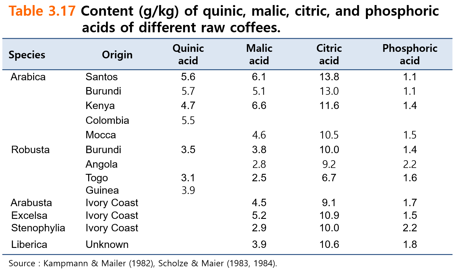 ➡ 여러 생두들의 퀴닉酸, 말릭酸, 씨트릭酸, 포스퍼릭酸의 함량들을 보여주고 있음.