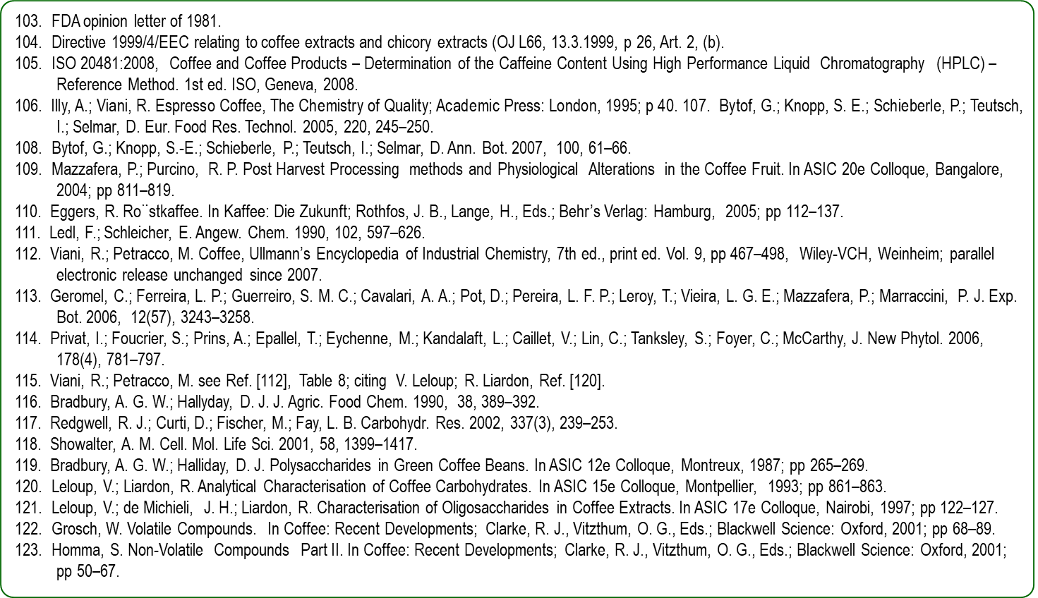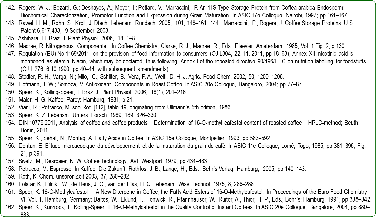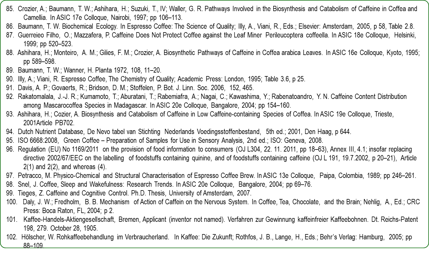 현대적 도구들의 활용을 통해 도달된 주요 커피 보관 化合物들의 핵심 生合成 徑路들에 대한 한 統合的 觀点이 최근에 발표되었다 [76]. 이는 여기서 더 자세하게 언급되지 않을 것이므로 독자들은 나무 생화학을 위해 이 논문을 참조할 수 있을 것이다.
