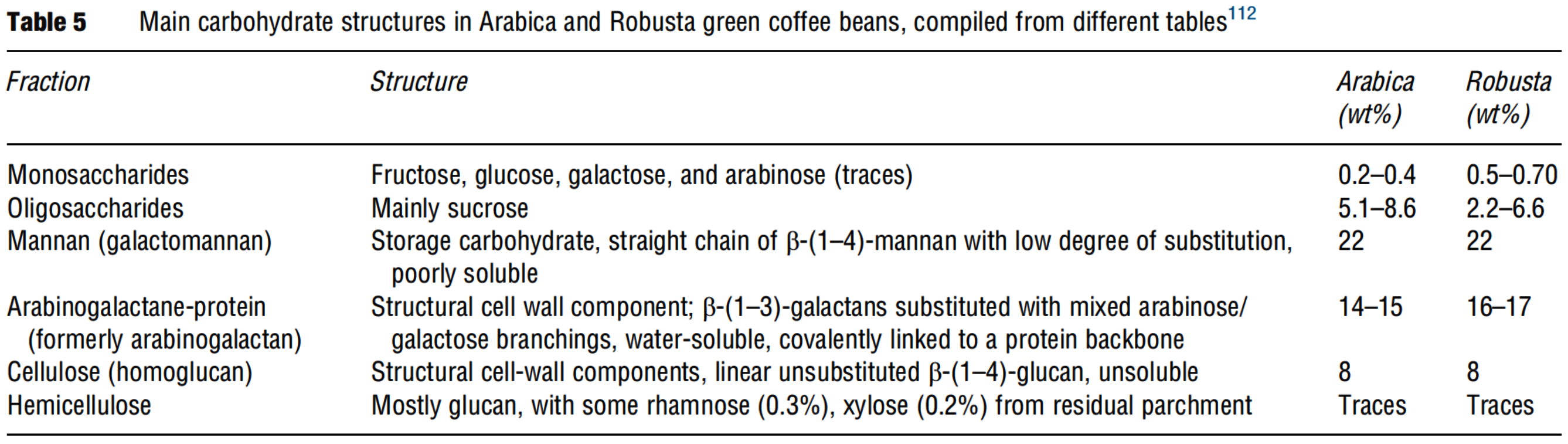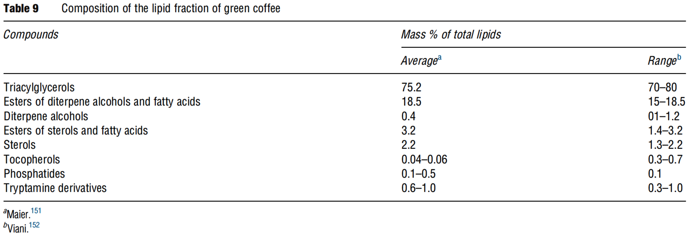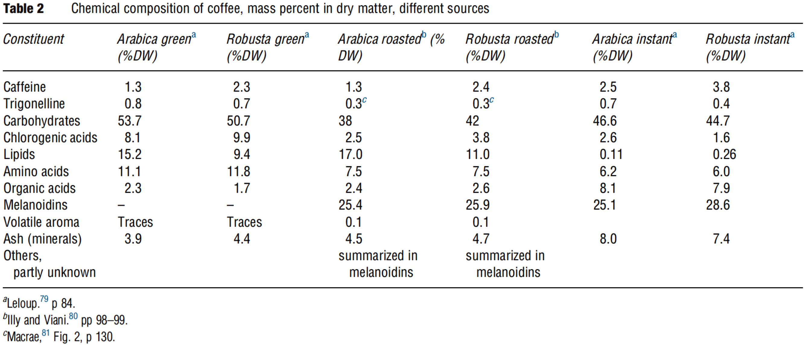 커피의 조성은 種마다 그리고 그 라인의 단계마다 다르다. Table 2가 분석 데이터의 개요를 제시하고 있다. 이 데이터는 문헌 리뷰들[80]과 성분 그룹의 요소들이 개별적으로 결정되고 요약된 다른 분석 배경들에서 시행된 연구들로부터 나온 평균들이다 [70].