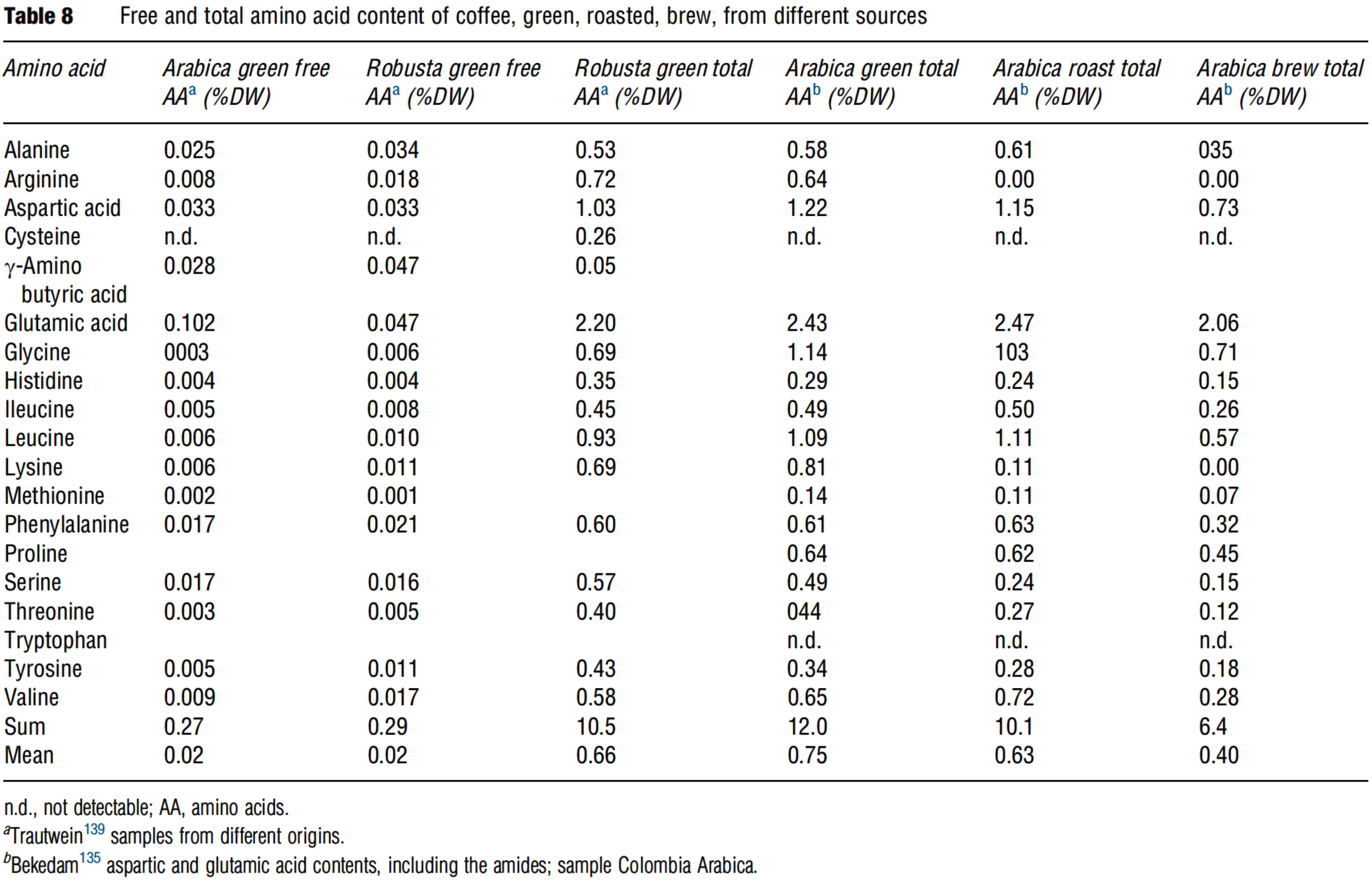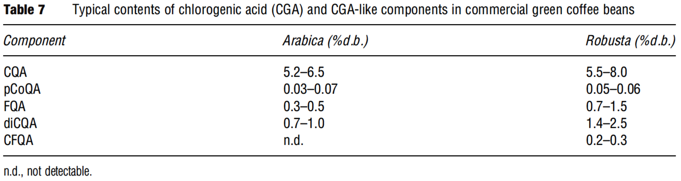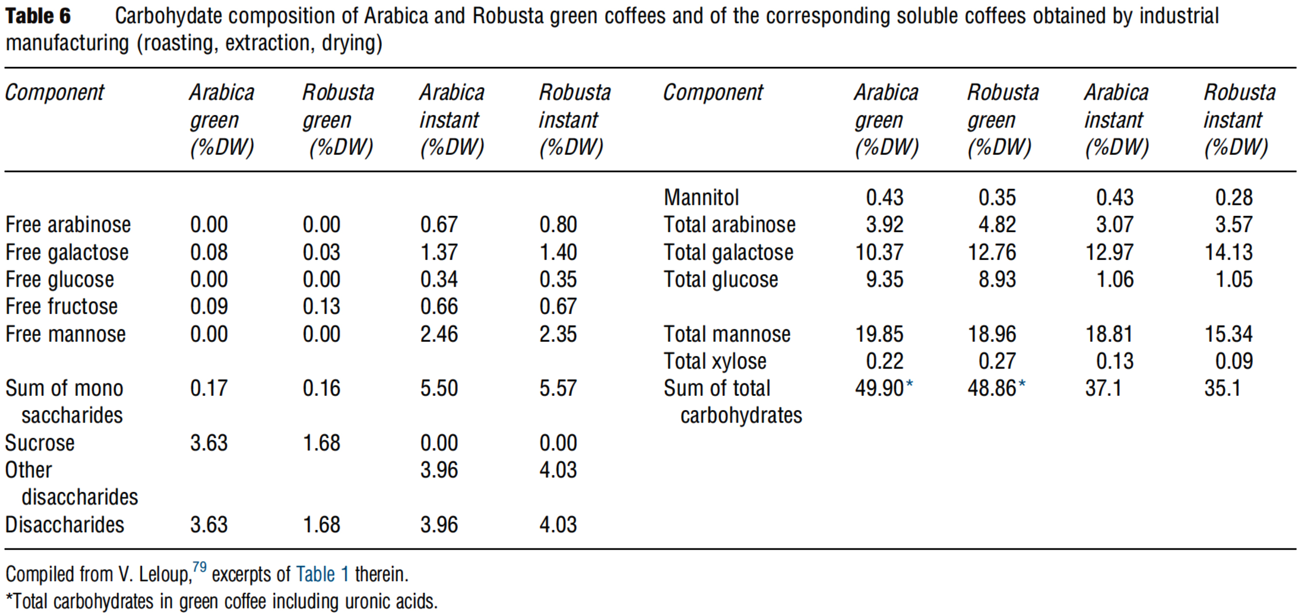 커피의 조성은 種마다 그리고 그 라인의 단계마다 다르다. Table 2가 분석 데이터의 개요를 제시하고 있다. 이 데이터는 문헌 리뷰들[80]과 성분 그룹의 요소들이 개별적으로 결정되고 요약된 다른 분석 배경들에서 시행된 연구들로부터 나온 평균들이다 [70].