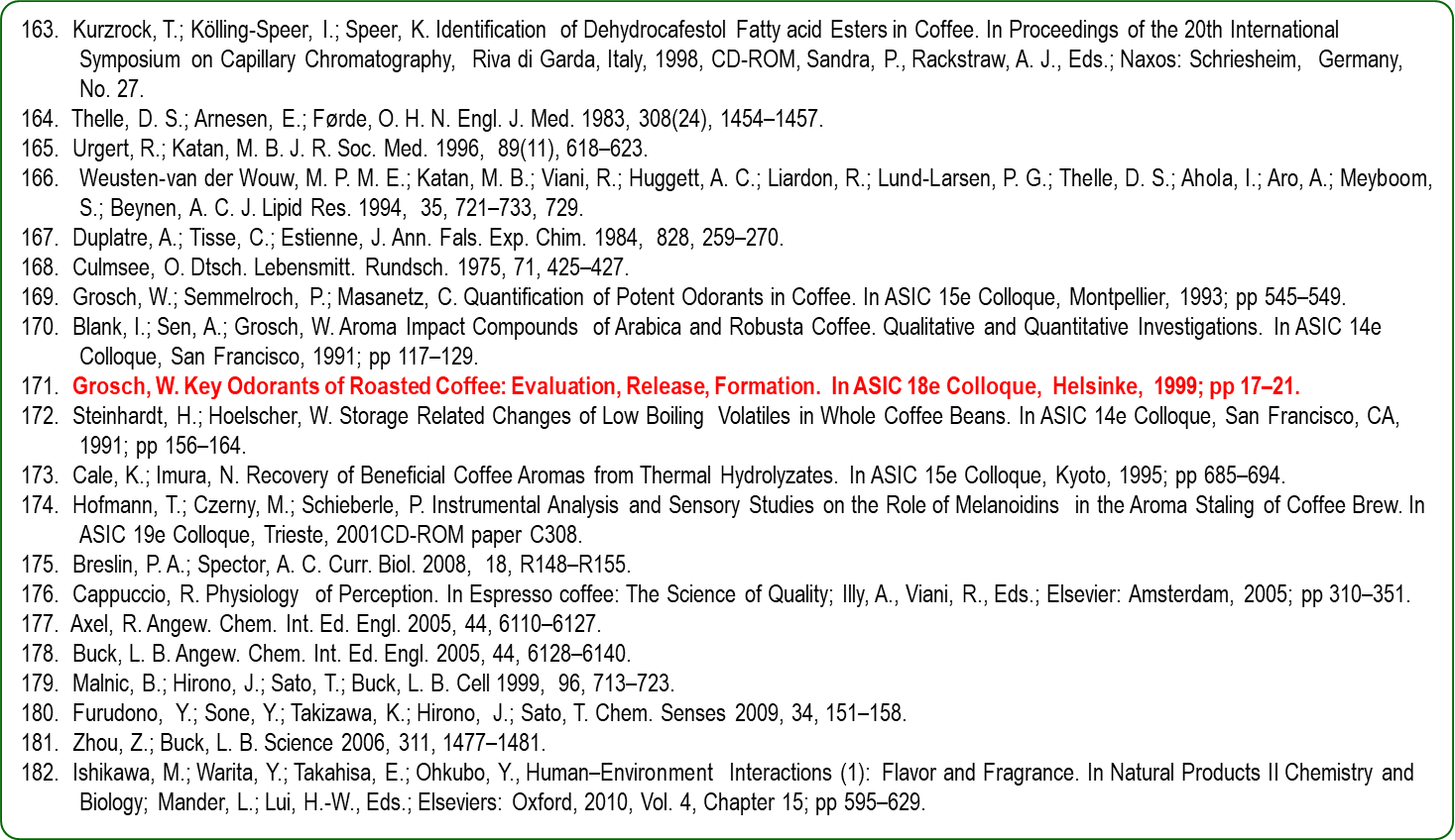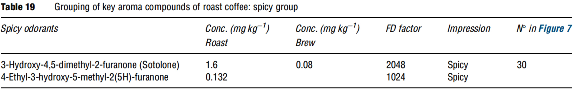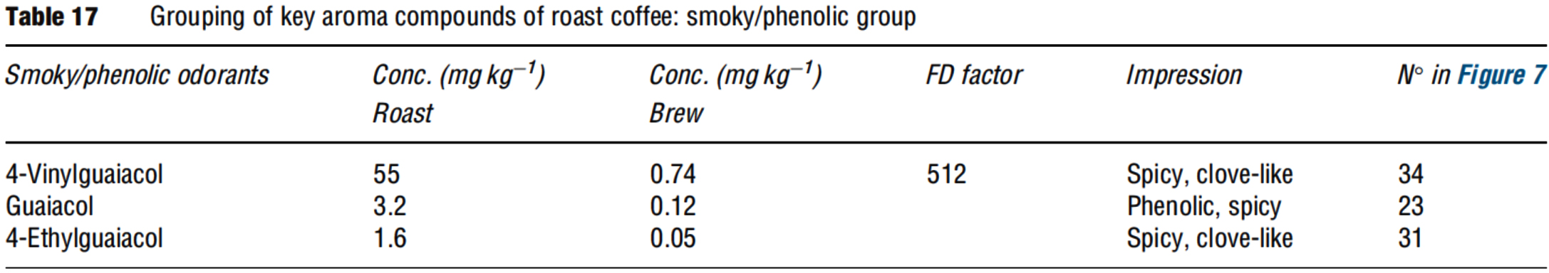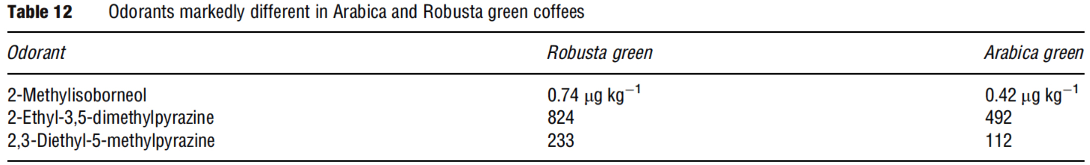 이 핵심 향기물질(key odorants) 중 어떤 것들은 Robusta와 Arabica 커피의 구별을 가능케 하기도 한다 (Table 12) [169].