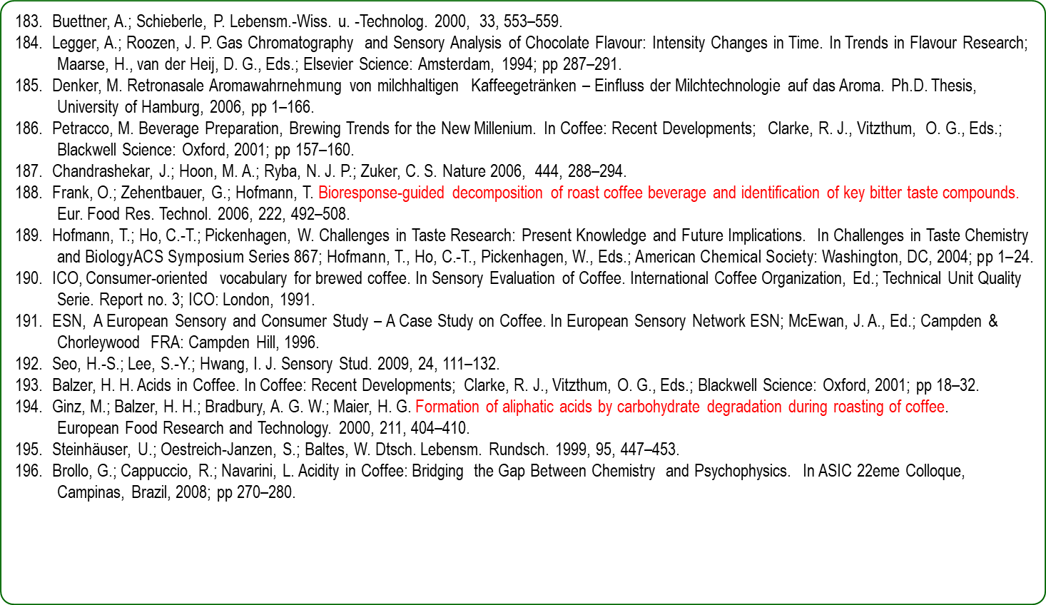 냄새 지각의 경우에, 후각 체계의 조직과 관여되는 주체들을 포함하여 기본적 메커니즘이 지난 수십년 동안에 널리 규명되어져 오고 있다 ; 2004년에, 그 발견들이 노벨상을 수상하여 가치를 인정받았다 [177, 178]. 최근에, 이 인간-환경 상호작용은 주요 참고 연구의 “Taste”와 “Flavor and Fragrance”라는 소제목으로 두 챕터들에서 다뤄졌다. Taste 챕터에서는[203], 맛 양상들(taste modalities)에 연관된 천연 산물들과 물질들이 항목별로 구분되어졌다. 커피 미각에서 중요한 “bitter”와 “sour”라는 basic tastes가 논의된다. 삼차신경의 지각(trigeminal perception)에 연결되는 astringency의 구강내 감각이 커피 내의 chlorogenic acids 때문인 것으로 설명되고 있다. 그 연구의 냄새 챕터는 지금까지의 개요를 제공하고 있다.