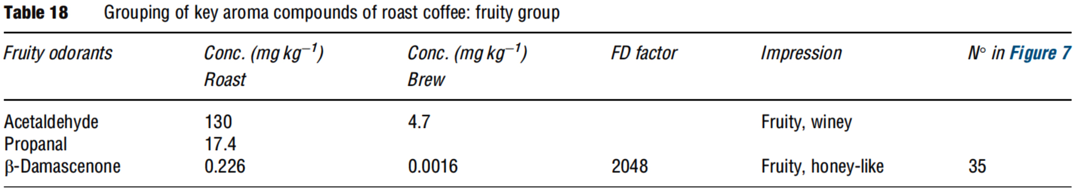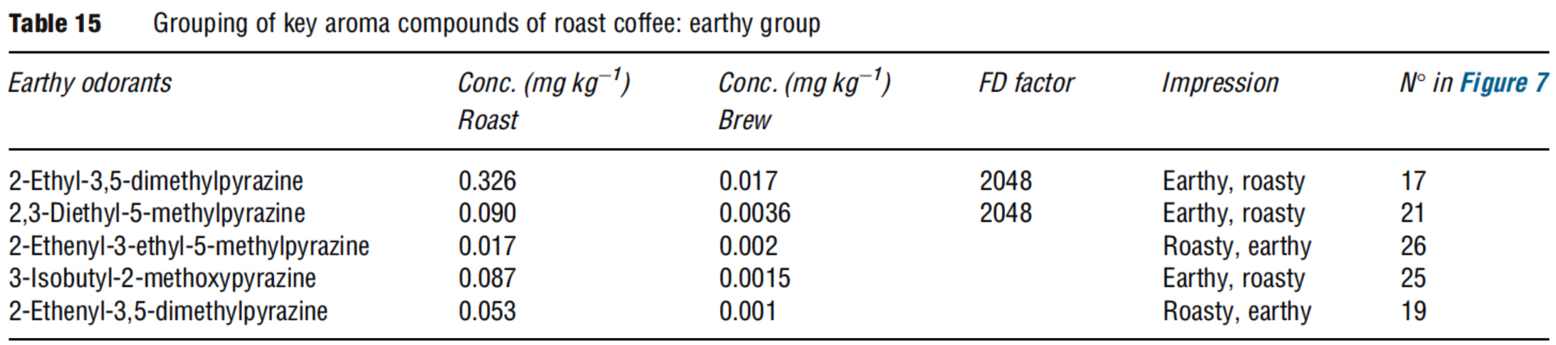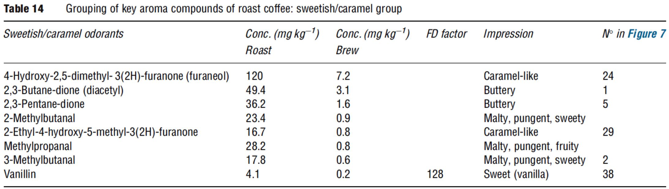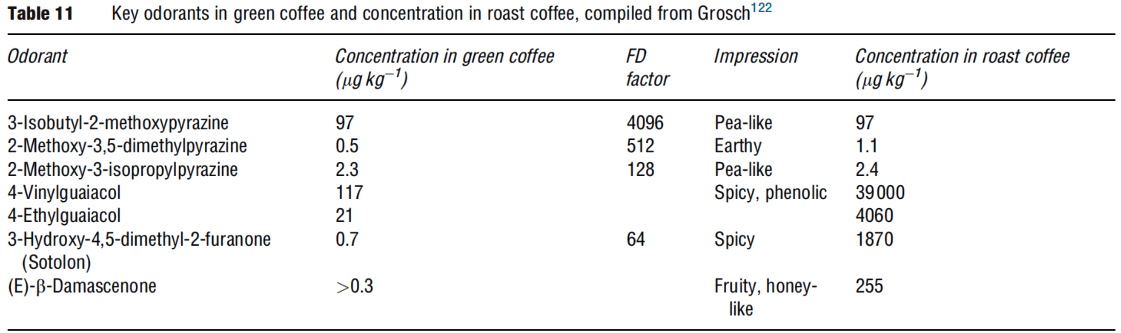 생두에서 약 200가지 휘발성 물질들이 파악되어왔다. 위에서 말한 방법들을 사용하여, 그중 일부가 가장 중요한 것으로 나타났다 (Table 11).