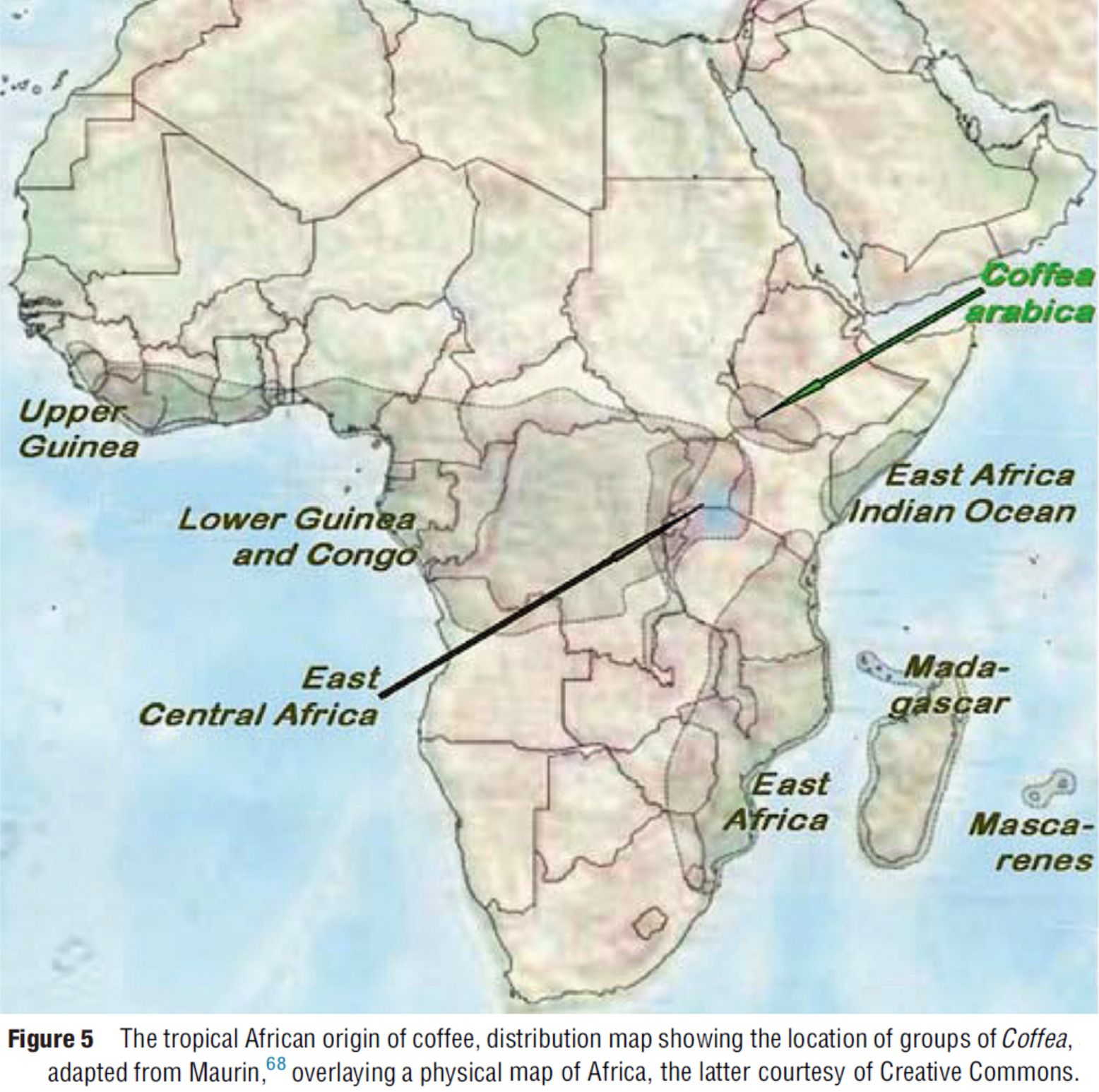 아프리카의 다른 종들과 그것들의 토착적 재배와 교역에 관한 보고들은 19세기부터 나온다. 동 아프리카 나라들의 경우에 1857년[17]과 1862년[18]의 원정들이 커피가 그곳 사람들에게 친숙했고 집의 정원에서 재배되었으며 [19, 20], 그리고 그것의 자극 효과 때문에 생두로 씹어 먹었다[21, 22]고 알려주었다. 이 커피 종들의 정체에 관한 논의 즉 ‘야생 아라비카 커피냐 혹은 그 자체의 독특한 종이냐’에 관한 논의가 1897년까지 계속 되었는데 [23], 그 때 몇 가지 비-아라비카 종들이 Coffea canephora Pierre를 포함하여, 나중에 ex A. Froehner가 접미어로 붙은 종이 Froehner에 의해 결정되었다 [25].