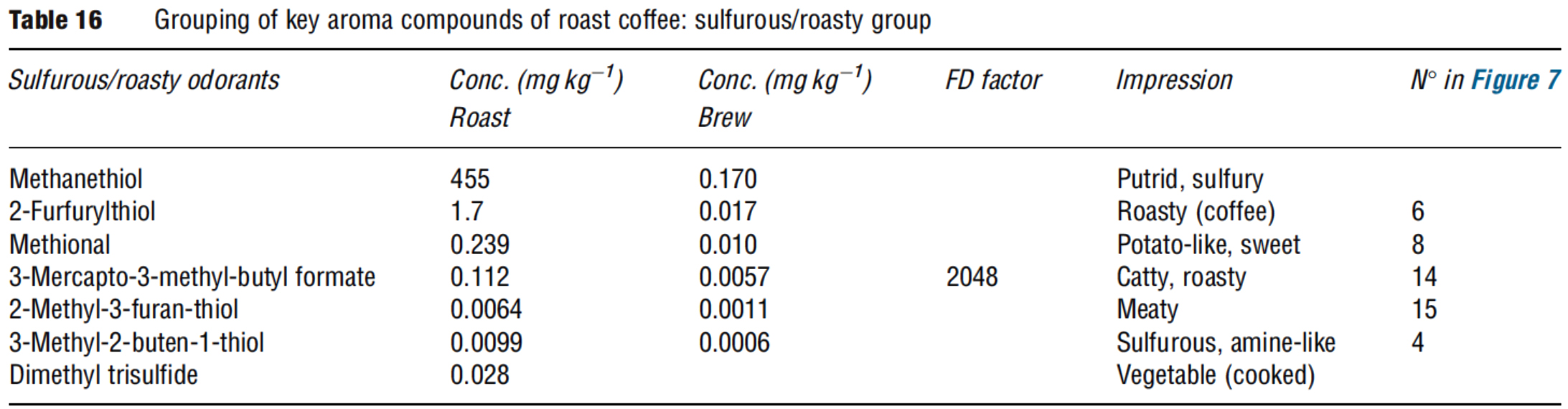 위에서 요약된 휘발성 아로마 화합물들의 그룹들 가운데, sulfury-roasty 성분들은 일반적으로 커피에 특별한 음료의 로스티 느낌에 공헌한다.