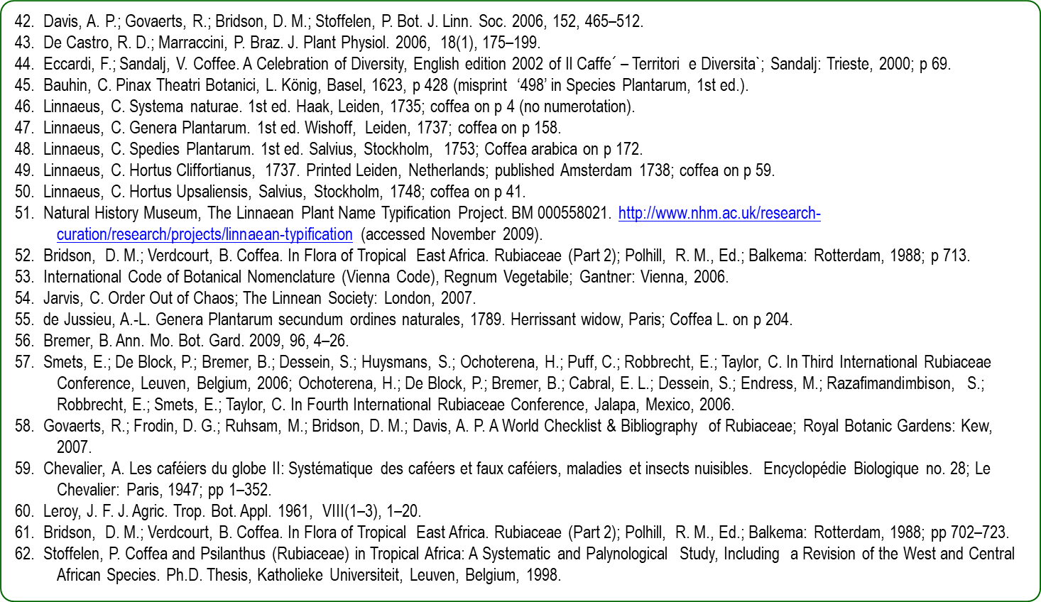 커피의 식물학적 분류는 고도의 합의에 도달해 왔고, 국제 컨퍼런스들에서 발표되고 [56, 57] the World Checklist of Rubiaceae에서 계속 발표되고 있다 [58] – 커피는 Jussieu 1789 이후로 이 패밀리에서 자리잡고 있다 [55].