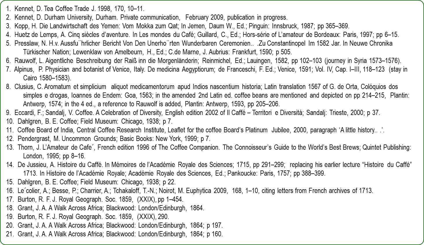 커피에 관한 상세한 정보가 과학자들의 여행기[6, 7]나 식물의 그림들과 그 소비에 대한 묘사를 실은 책의 인쇄본들을 통해 동 시대에 유럽의 기독교 파트에 도달했다. 열대 식물에 관한 더 초창기의 표준적인 연구의 1574년 개정판에서 언급되기 전에도 벗겨진 콩들이 유럽 과학자들 사이에 돌아다녔다 [8].