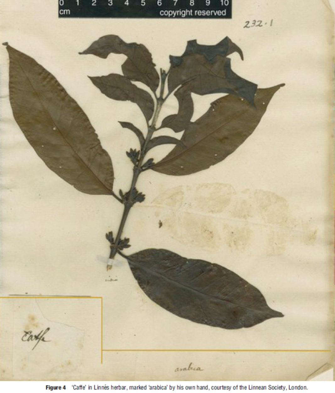 Figure 4는 종이 위에 눌러지고, 건조되고 고정된 Linné의 오리지날 개인 식물표본첩의 커피를 보여준다 (No 2490 of the Linnaean Herbarium at the Linnean society London, Salvage No. 232.1; ‘india’라는 표시는 아마 그 種의 원산지를 가리키는 것일 것임; 1784년에 Linné’s widow으로부터 구입된 콜렉션).