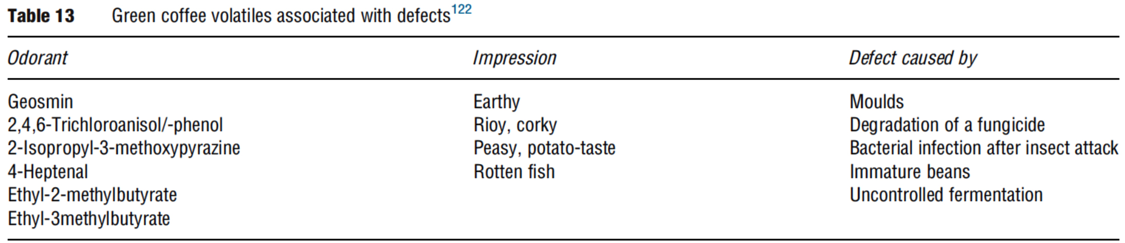 철저한 조사에서, 어떤 생두의 휘발성 물질들이 결점두들의 특징으로 파악되었고, 이들은 프로세싱 동안에 과발효에 의한 것일 수도 있고, 또는 벌레 공격에 의한 것일 수도 있다 (Table 13) [80,120].