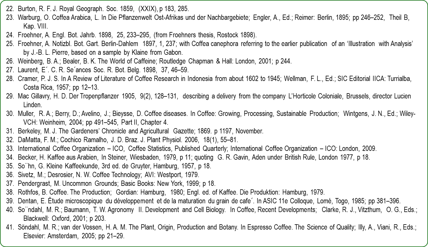 한 세기 후에, 포괄적인 기술적 체계화가 Linné에 의해 제안되었다; 린네는 처음부터 genus Coffea를 포함하여 쉽게 파악가능한 floral structure의 특징들로 식물 부류들을 설정했고 [46, 47], 1735년과 1737년에 출간하였다. Coffea arabica로의 그 종에 대한 최종적인 명명은 1753년 그의 ‘Species Plantarum’에 제시되었다. 이 연구는 식물에서의 직접적인 관찰들과 식물표본첩(herbaria) [49, 50], 그리고 동료들과의 논의와 교환들에 기초하였다. 그는 1713/1715 the Royal Academy in Paris를 위해 커피에 대한 Jussieu의 묘사를 인용하였다 [14].