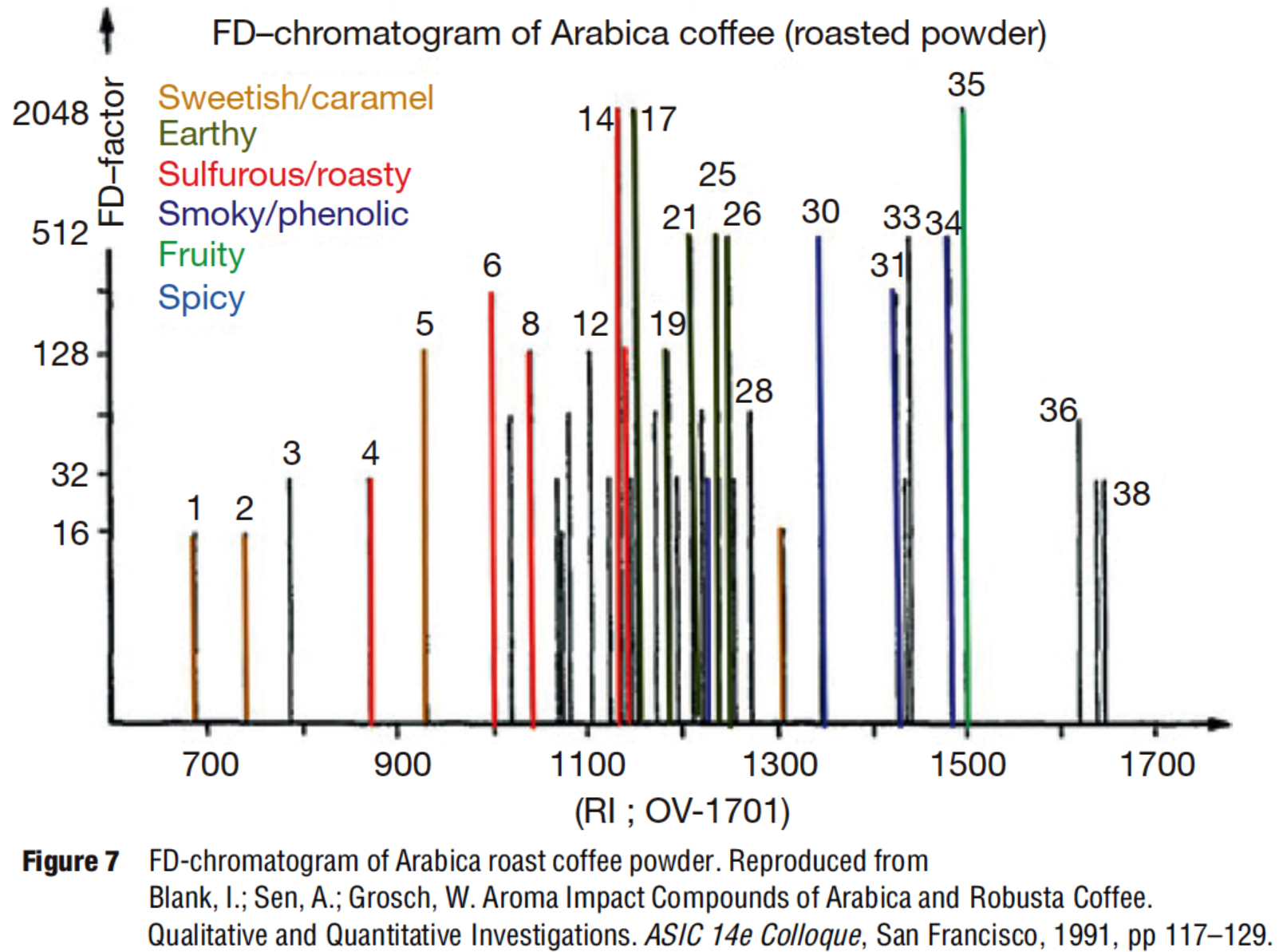로스트 커피 아로마는 1000 가지 이상의 휘발성 화합물들의 복잡한 혼합체이다. 앞서 언급된 도구들로, 그것들의 량이 약 20가지 핵심 아로마 화합물들로 축약될 수 있었다 [122].