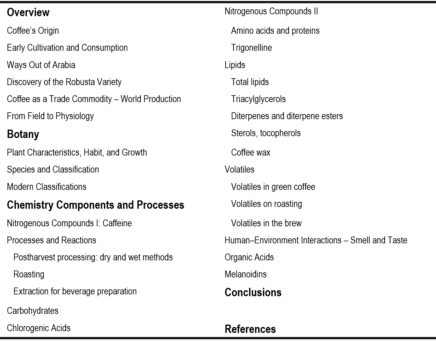 다음 섹션들은 커피의 주요 성분들인 카페인, 탄수화물, 클로로겐산, 지질, 기타 질소함유 화합물, 휘발성 화합물, 그리고 멜라노이딘류를 다루며, 그 변환 과정들도 포함한다.