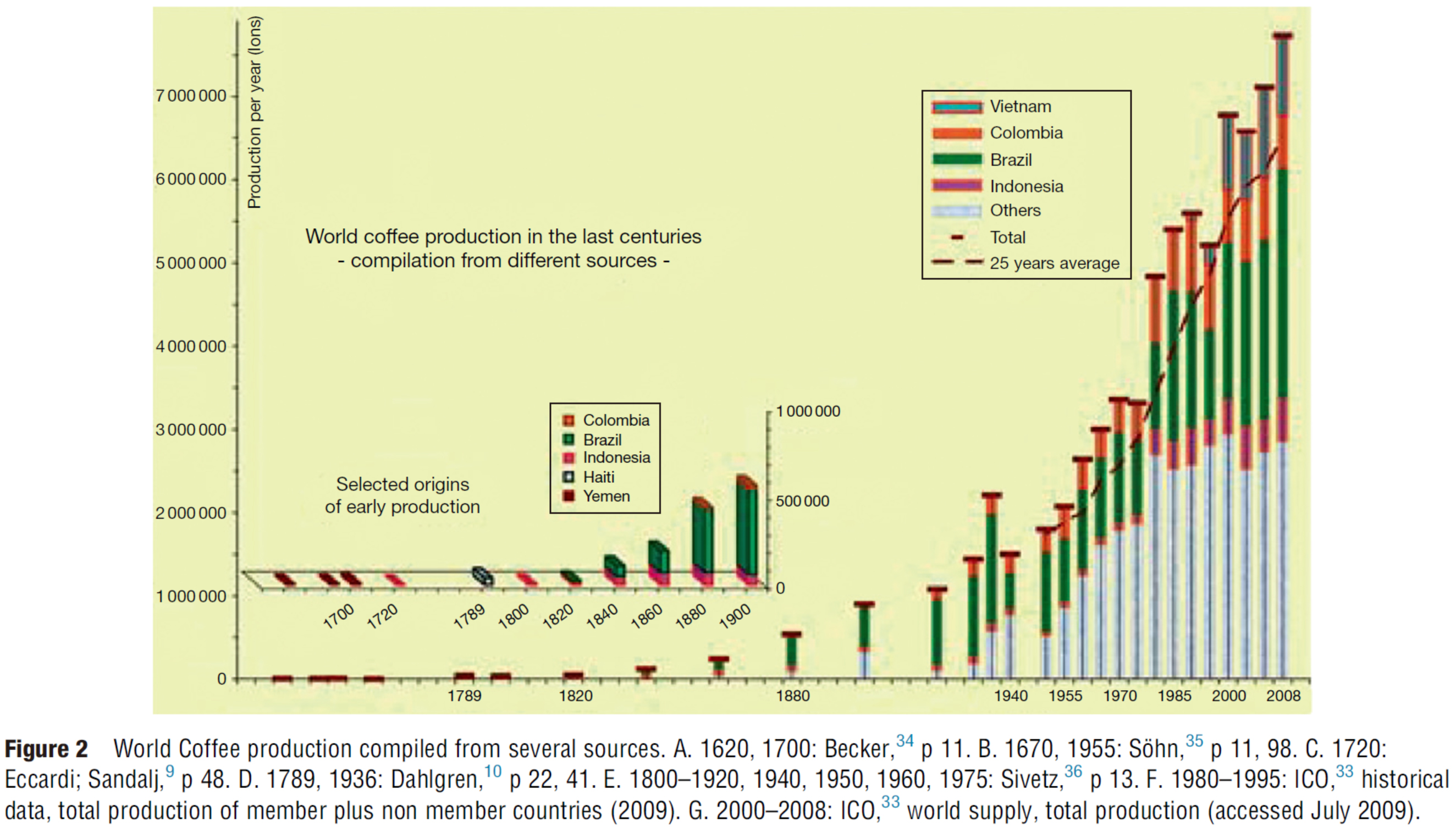 커피 총 생산에 관한 데이터는 1620년 이래로 전반적인 증가와 새로운 생산 지역들의 등장을 보여준다. 몇몇 출처들로부터 편집된 이 데이터는 그래프로 Figure 2에 제시되어 있으며, 오늘날 개별적으로 표시된 최대 플레이어들 량도 함께 제시하고 있다.