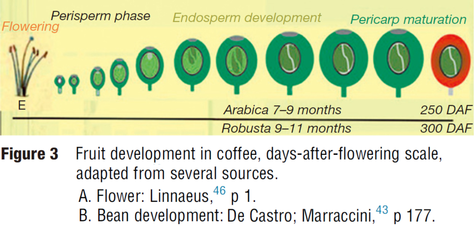 Figure 3에 묘사된 開花後 日數(days-after-flowering – DAF) 스케일에서 [43], 성장하는 열매의 조직들은 果皮(pericarp), 外胚乳(perisperm), 그리고 胚乳(endosperm) 모두에서 부피 랭킹의 큰 변화들을 보인다. 시작하는 果皮에 포함된 外胚乳가 果皮 덩이와 같아지도록 擴張한다; 그런 다음 그것은 발달하는 胚乳에 의해 흡수되고, 이 胚乳는 그 열매 내의 모든 貯藏 化合物들을 위한 최종 조직이 된다.