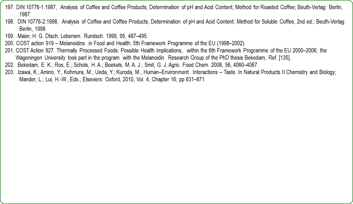 커피 음료 테이스팅 중에 지각되는 전반적인 애씨더티(overall acidity)는 종점까지 총 적정산도(total titrable acidity)에 상관되는데, 이는 6에서 7까지 변하는 타액(saliva)의 pH setting을 닮았다; 좋은 값은 6.7 정도일 수 있을 것이다. 그 상관은 합리적인 것으로 보이며, 반복으로 확인된 바 있다 [196]; 결정을 위한 한 분석 절차가 표준화된 방법들로 정립되었다 [197, 198].