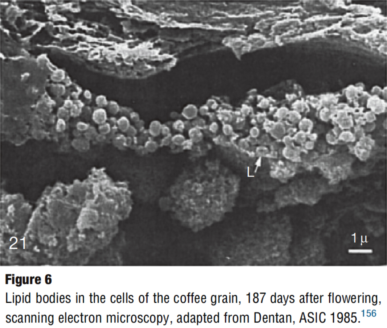 커피 열매의 성장과 숙과의 발달 단계들 동안의 별도 요소들의 콩내 위치가 組織 染色에 의해 서포트되는 電子顯微鏡으로 관찰되어져 왔다. 1977년 부터 Association for the science and information on coffee (ASIC)의 컨퍼런스들에서 제시된 연속적인 논문들이 아주 인상적인 발견들을 보여주었다 [83] : 성분들은 그들의 세포 환경과 관찰된 이동들에서 구분되어져 왔다.