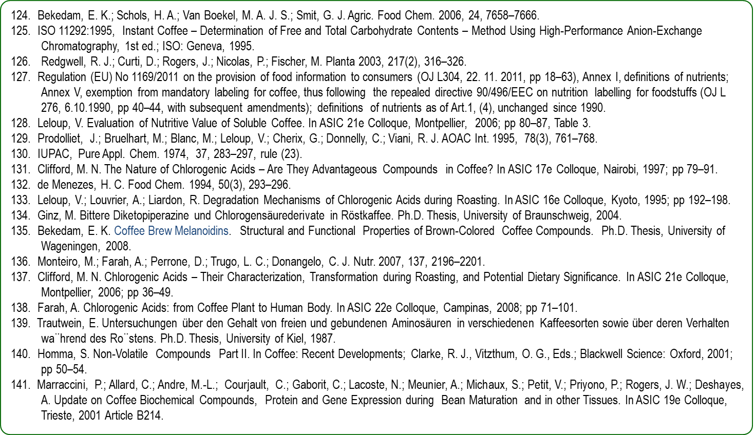그 개요가 2001년에 나온 바 있다 [193]. 몇 가지 출처들로부터 편성되어, 생두, 배전두, 솔루블 커피의 질량 함량이 보고되었고, 로스팅과 추출로 그 변화들을 커버한다.