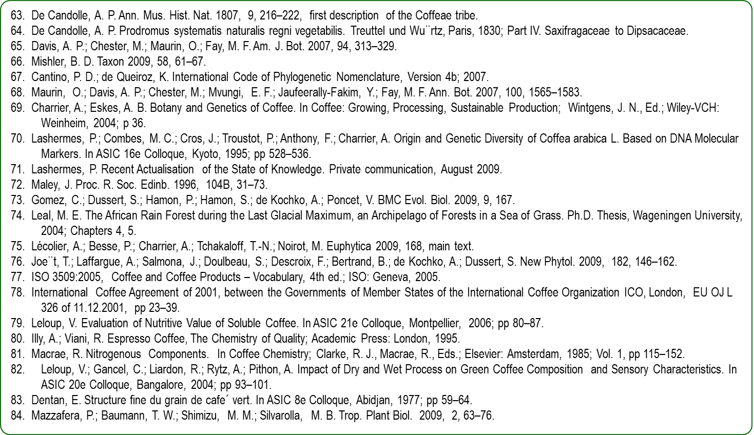 the Botanical Code의 면에서는, Rubiaceae와의 family rank로 시작하는 커피의 분류 혈통(classification lineage)은 Ixoriadeae 亞屬(subfamily), Coffeae DC 族(tribe)을[63, 64] 거쳐 Coffea L.屬(genus)으로 내려간다. 모든 음료용 커피들을 포함하여 그 屬의 약 100 가지의 인정된 種들(species)이 Coffea 亞種(subgenus)에 속한다 ; Baracoffea 亞種은 약 10개의 種들을 가지고 있다 [42]. 그것이 실상이다. 그럼에도 불구하고 추급적인 개선들(refinements)이 있다 [65].