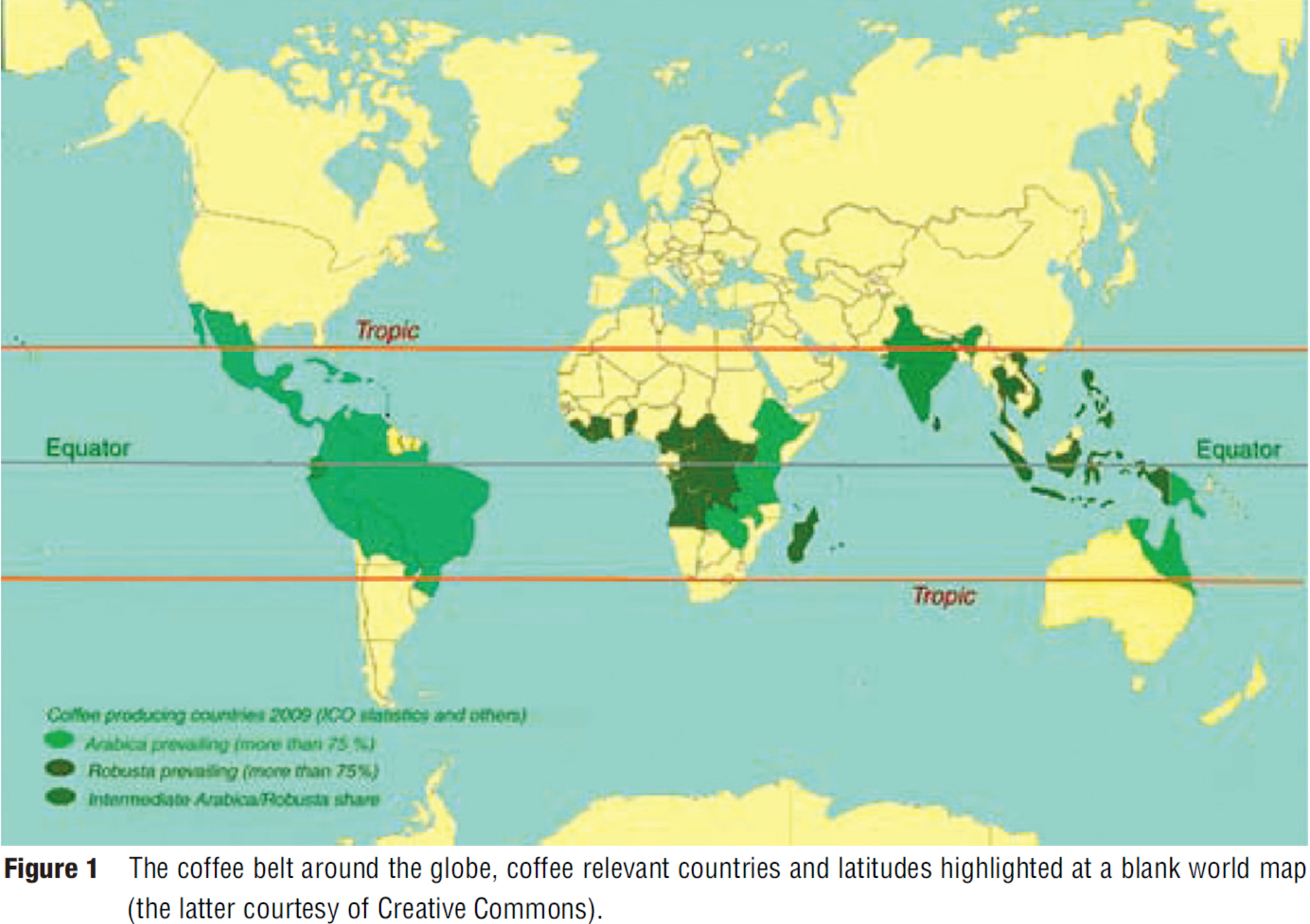 커피는 회귀선들(tropics) 사이에 놓인 지역들에서 가장 잘 자란다. 오늘날, Figure 1과 같이 지리적 벨트에 속하는 거의 모든 대륙에서 발견되며, 아주 최근에는 오스트레일리아에서도 발견되고, 이 지도에서는 표시되어 있지 않지만 중국의 연남(Yunnam) 고원지대에서도 발견된다.