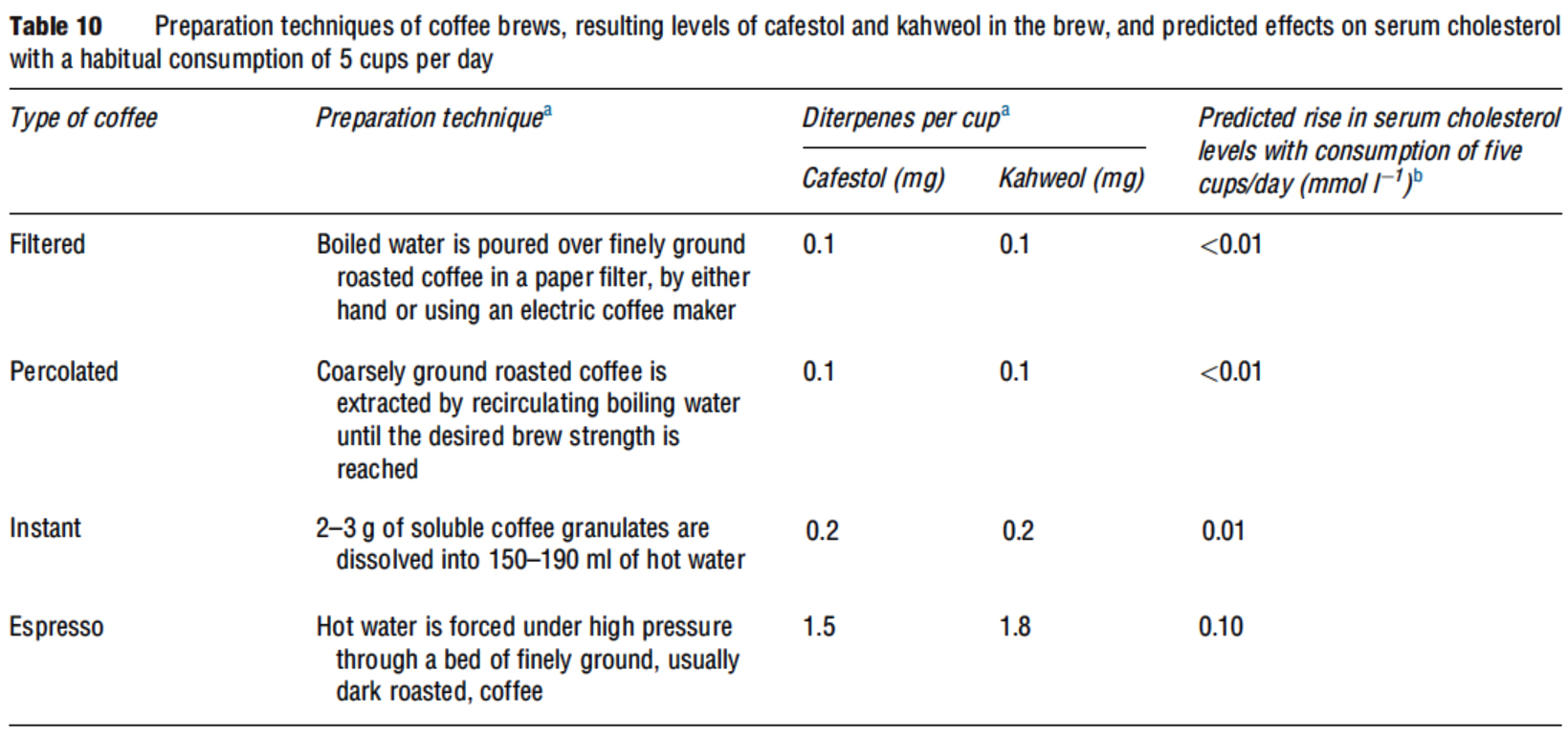 그 동안에, 대부분의 스칸디나비아인들은 전통적인 boiling style에서 filtering method로 커피 메이킹의 습관을 바꾸어 왔다; 커피의 콜레스테롤 상승 효과가 더 이상 거기에서는 문제가 아니다. 다른 커피 마련 테크닉들에 있어서 선택은 소비자에게 있다.