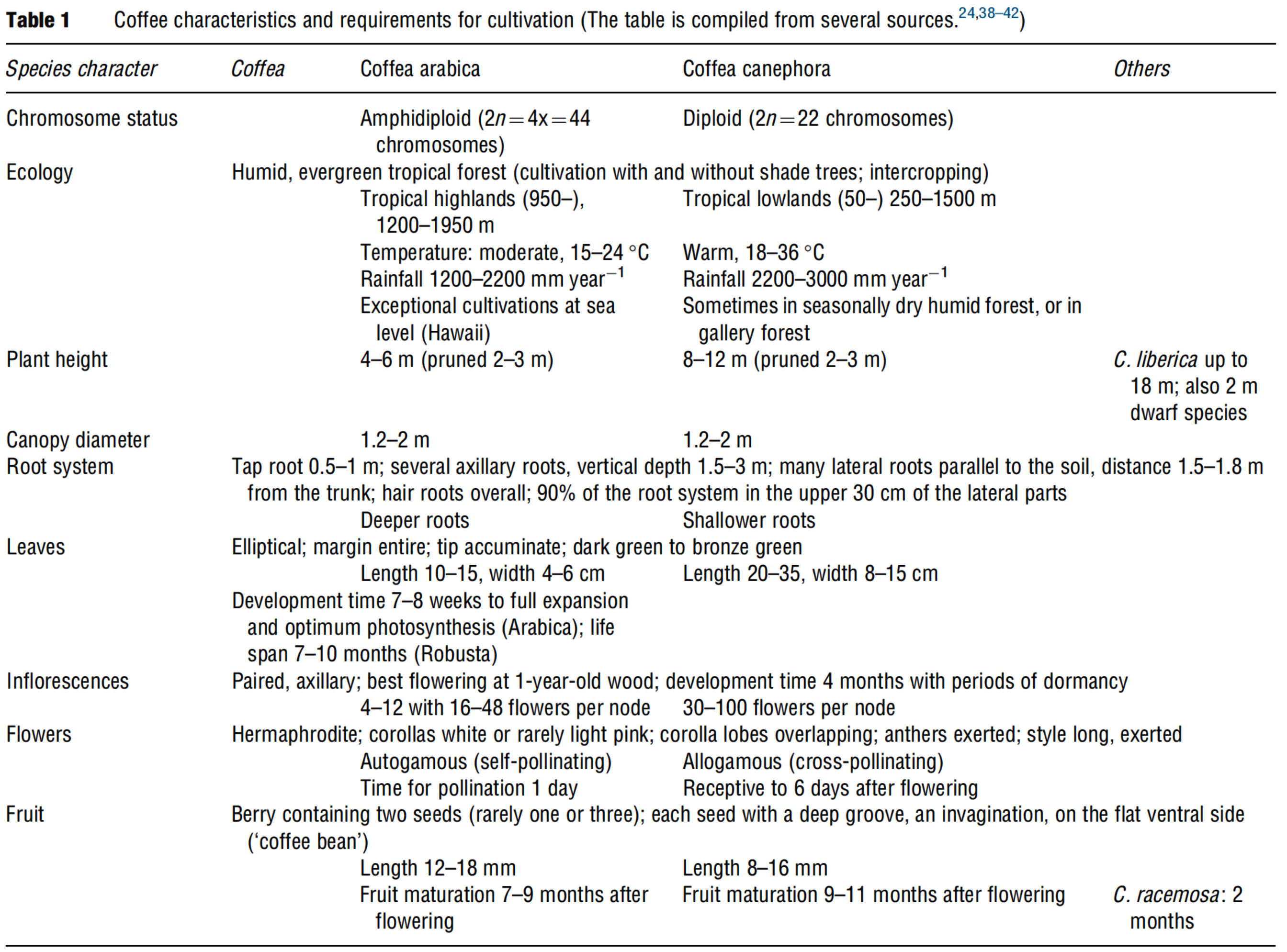 커피에는 Arabica와 Robusta, 2가지 種이 있으며, 각각 생태를 가지고 있다. 커피는 무역 가치 측면에서 가장 중요한 상품 중 하나이다 (Simpson & Conner-Ogorzaly, 1995: 448).