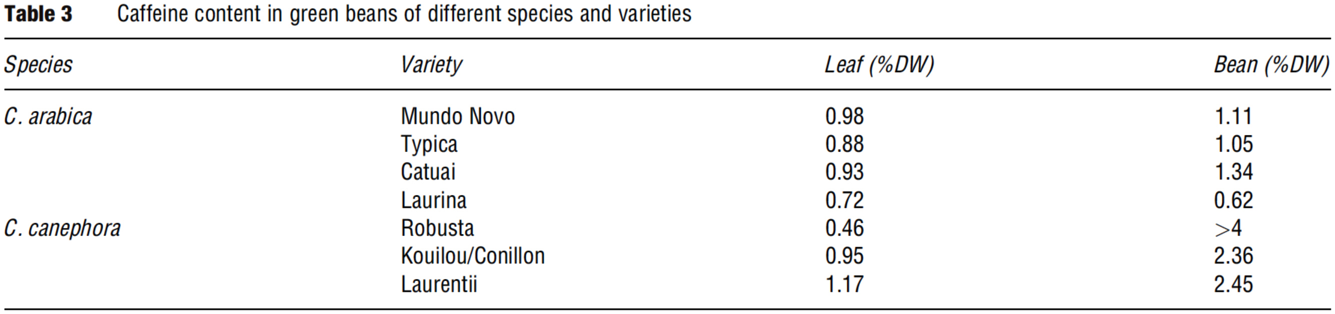커피 콩의 카페인 함량은 種과 變種에 따라 다른데, Laurina의 경우 0.6%에서부터 일부 심한 Robustas에서는 4%까지 이른다 ; 평균이 Table 3에 나와 있다 [90].
