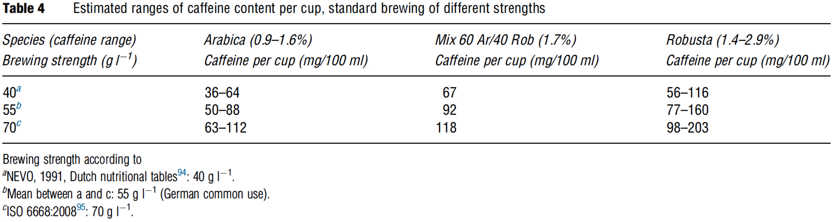 Table 4의 데이터는 표준적인 음료 마련을 나타낸다 – 다른 것들도 있다. 에스프레소-스타일 퍼콜레이션에서는, 30 ml 한 잔에 분쇄커피 6.5g이 들어갔다; 위에서 언급된 average blend로는, 약 87 mg의 카페인이 기대될 수 있다. 세포 구조로부터 카페인을 추출하는데 사용될 수 있는 가능한 시간이 매우 짧아 겨우 75–85%의 추출 수율만을 초래한다 [97].