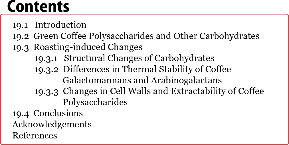 - 본 장에서는 커피 생두와 로스팅된 커피 탄수화물의 구조적 특징과 풍부함, 그리고 추출액(brew)으로의 추출가능성(extractability)을 제시하여 29장에서 멜라노이딘(melanoidins)에 대한 프레젠테이션과 논의를 위한 길을 연다.