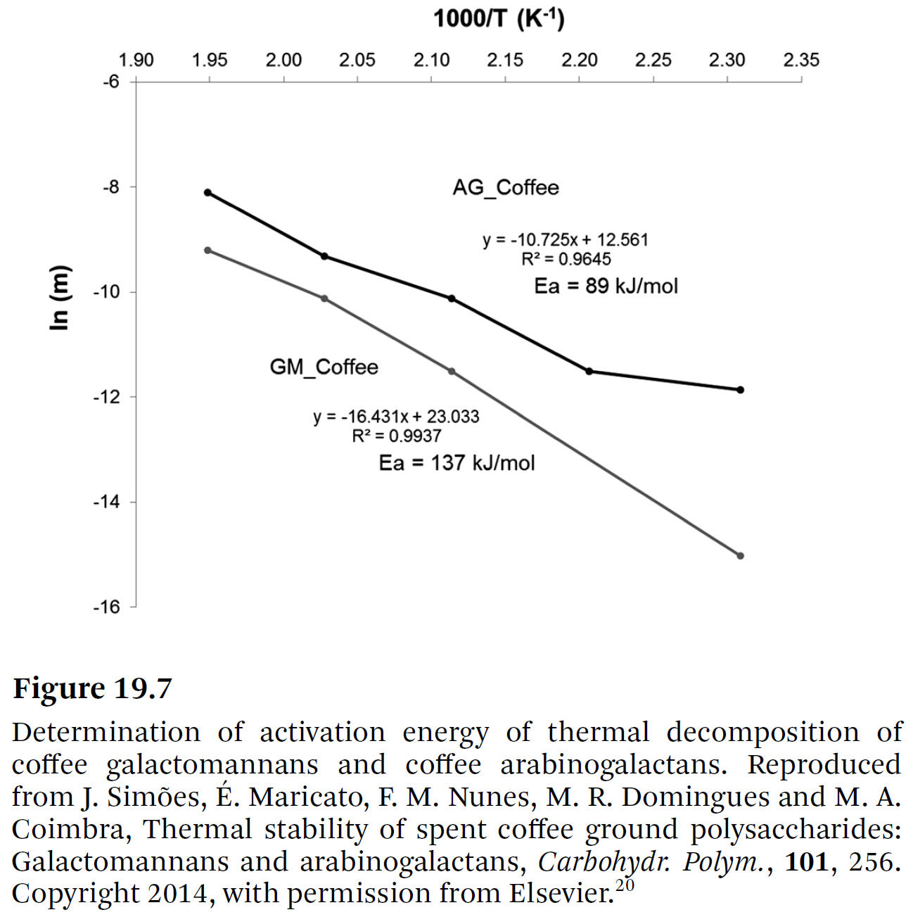- 커피 arabinogalactans의 다양한 등온 중량 감소 곡선(Figure 19.6B)에서도, galactomannans 열중량 측정 프로파일에서 관찰된 것처럼, 두 가지 주요 질량 손실 단계가 있다.