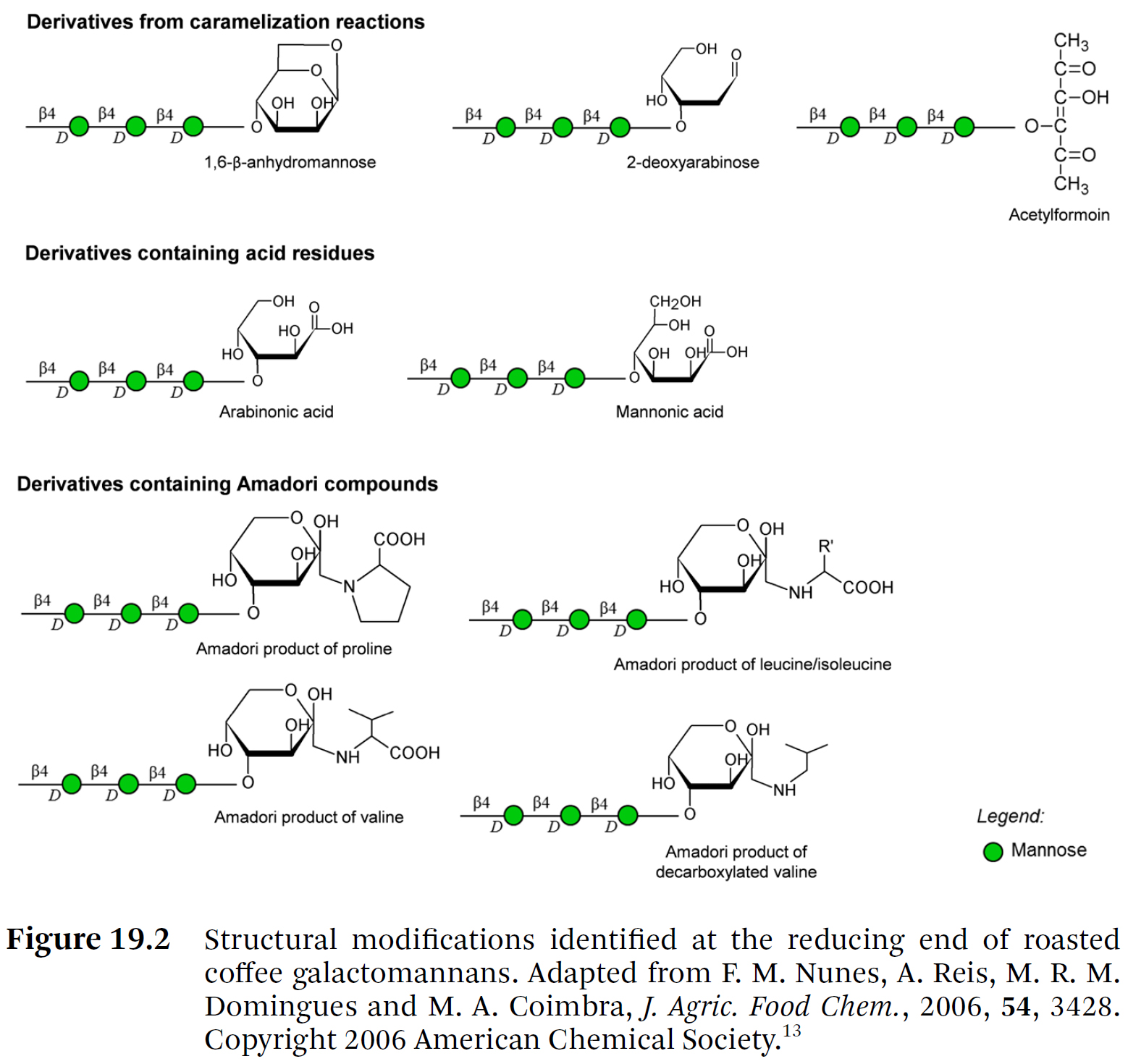 - 이는 뜨거운 물에 녹는 로스트 커피 galactomannans의 β-endo-mannanase 가수분해(hydrolysis)로 얻은 올리고당의 환원 말단(reducing end)에서 1,6-β-안히드로만노스(anhydromannose), 만논산(mannonic acid), 아라비노닉산(arabinonic acid), 아마도리 화합물(Amadori compounds) 등의 발생에 의해 관찰되었다 (Figure 19.2).[13]