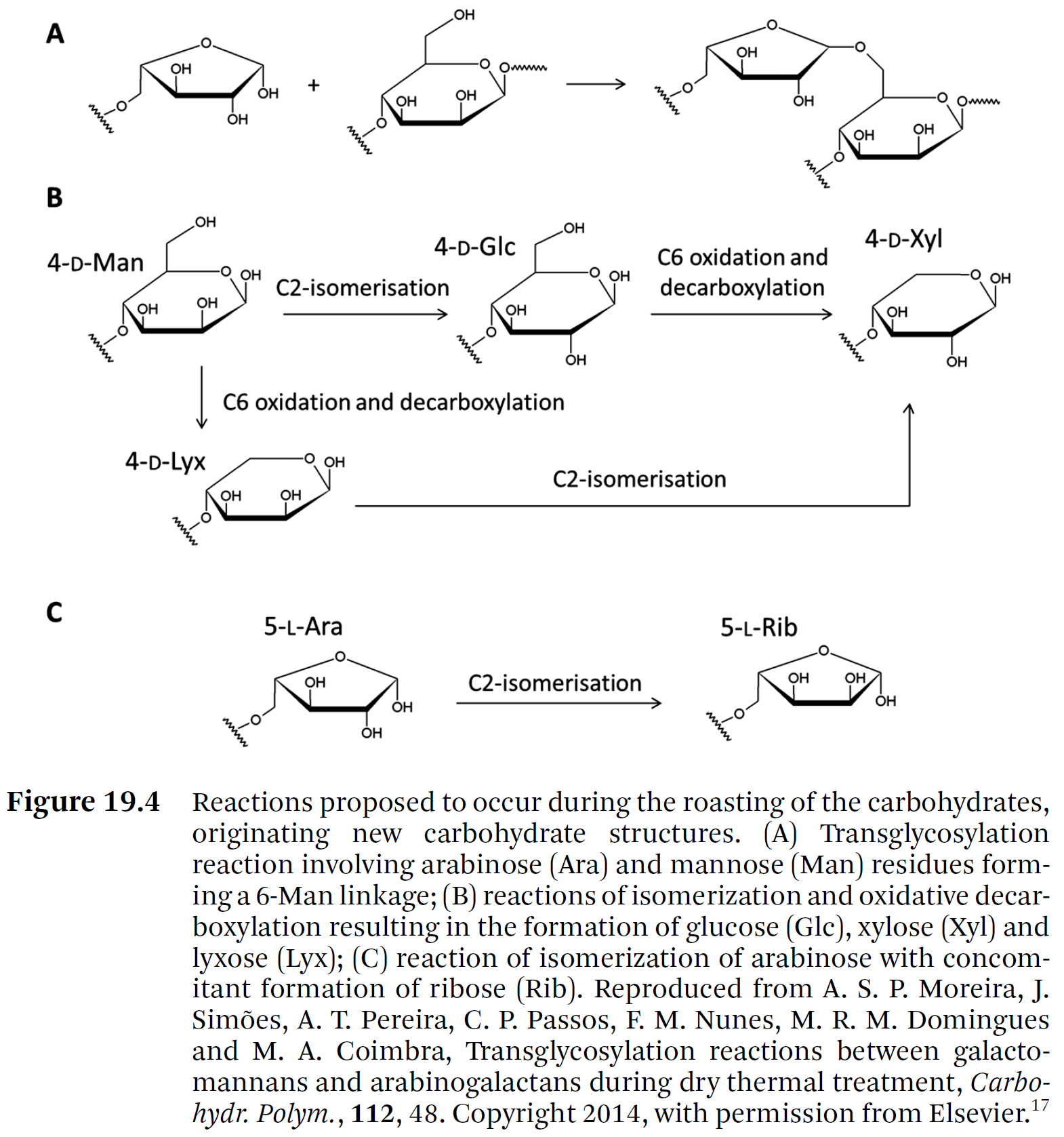 - Galactomannans와 arabinogalactans 구조도 로스팅 과정에서 탈중합(depolymerization), 탈분지(debranching), 탈수(dehydration), 이성질화(isomerization), 중합(polymerization)(비효소적 트랜스글리코실화를 통해) 반응이 발생하여 변화한다.
