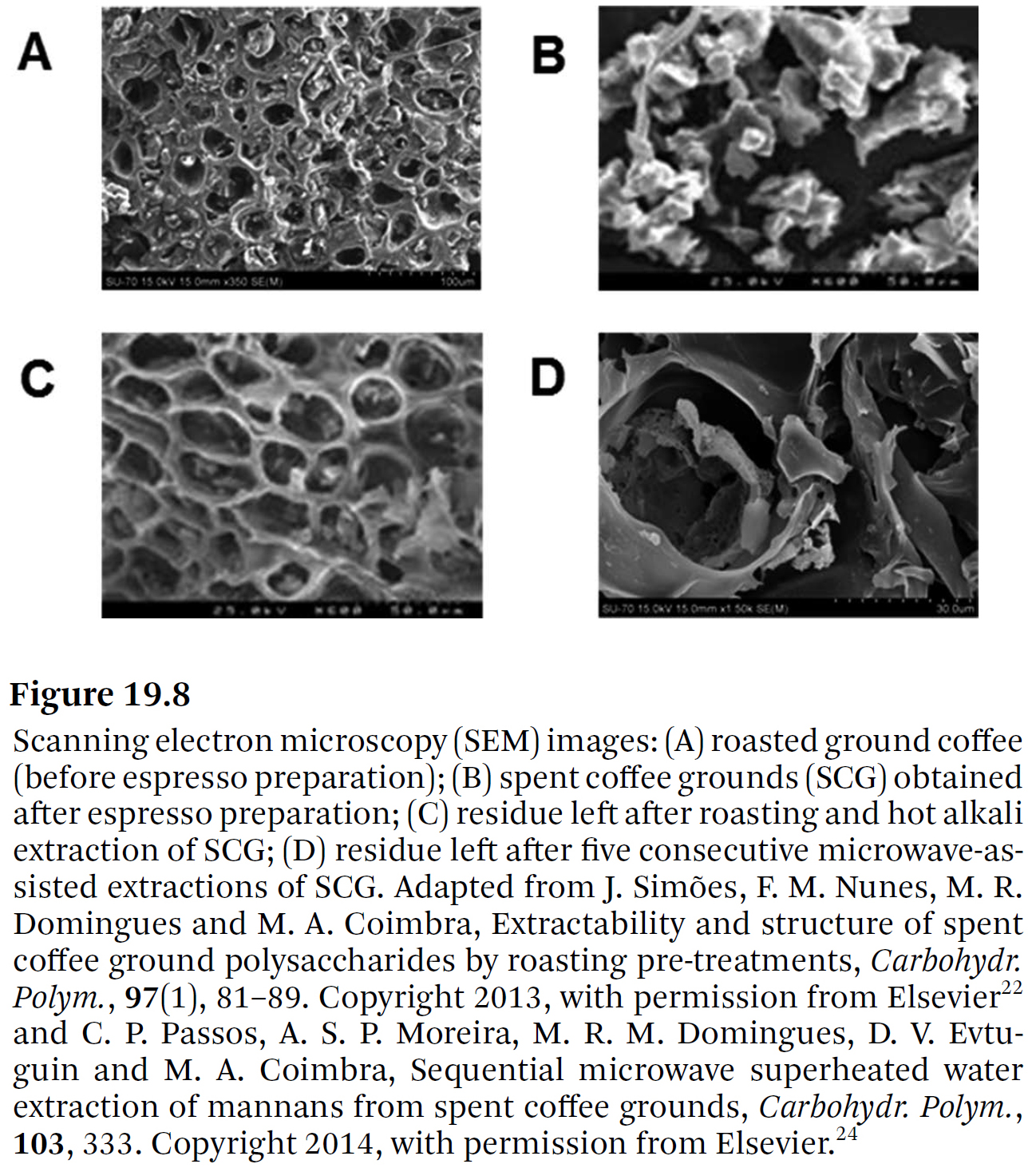- SCG를 로스팅하고 NaOH로 추출한 후 남은 잔류물의 SEM 이미지(Figure 19.8C)는 더 잘 정의되고 속이 빈 구조, 아마도 세포벽이 나타나는 것을 보여준다.