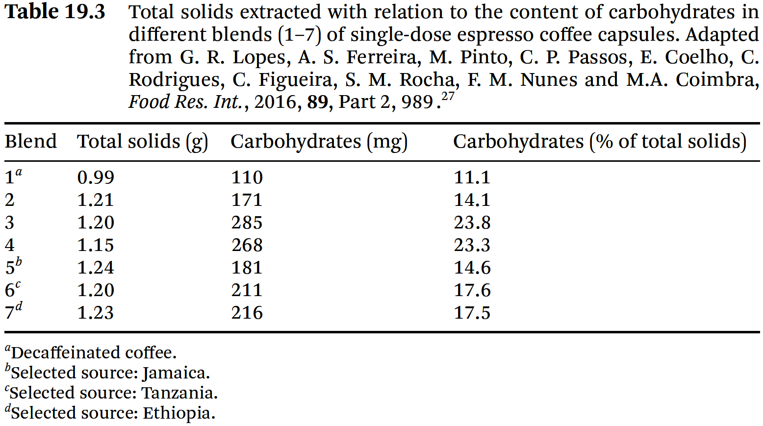 - 싱글-도우즈 캡슐 시스템로부터 만든 에스프레소 커피의 탄수화물 함량은 컵당 110~285 g으로 총 고형물의 11~24%를 차지한다 (Table 19.3).