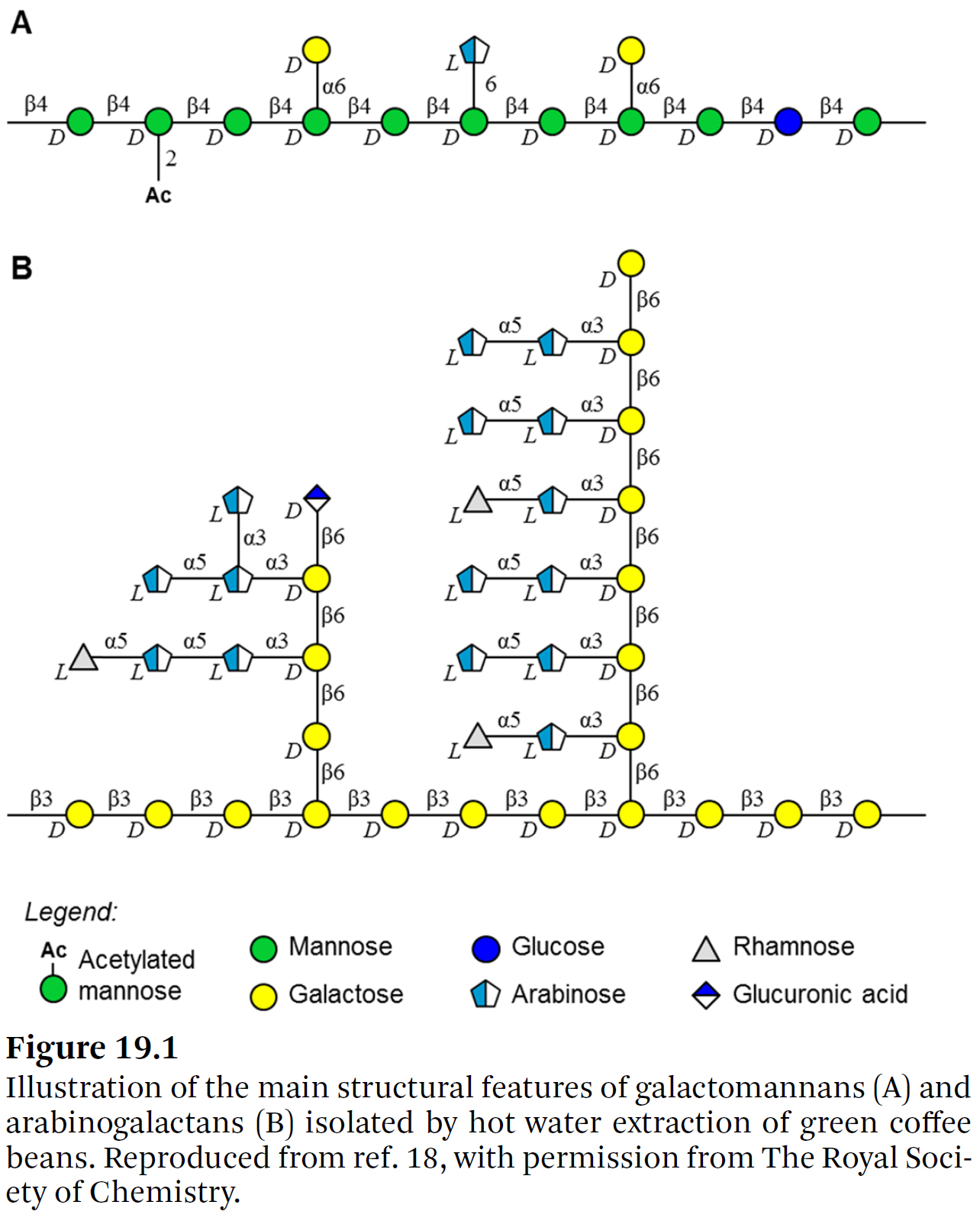 arabinogalactans는 57–69%를 차지한다. [5,6] - 열수 추출할 수 있는 생두 갈락토만난은 (β1→4)-linked d-mannose residues의 주요 백본으로 구성되며, 일부는 O-6에서 α-d-galactose 또는 l-arabinose의 단일 잔기(single residues)로, O-2 및/또는 O-3에서 아세틸基(acetyl groups)로 치환된다 (Figure.19.1A).