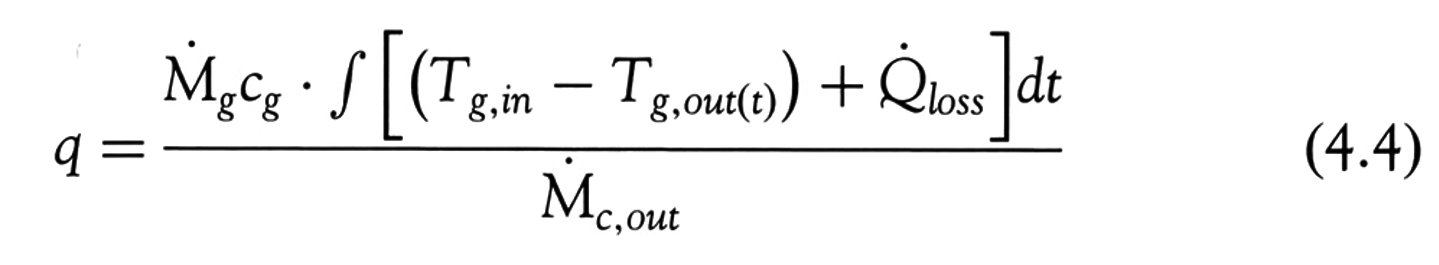 특정한 기체 열을 상수로 설정함으로써 특정 에너지 수요 q [kJ/kg roastcoffee]는 다음과 같은 것이 된다 :
