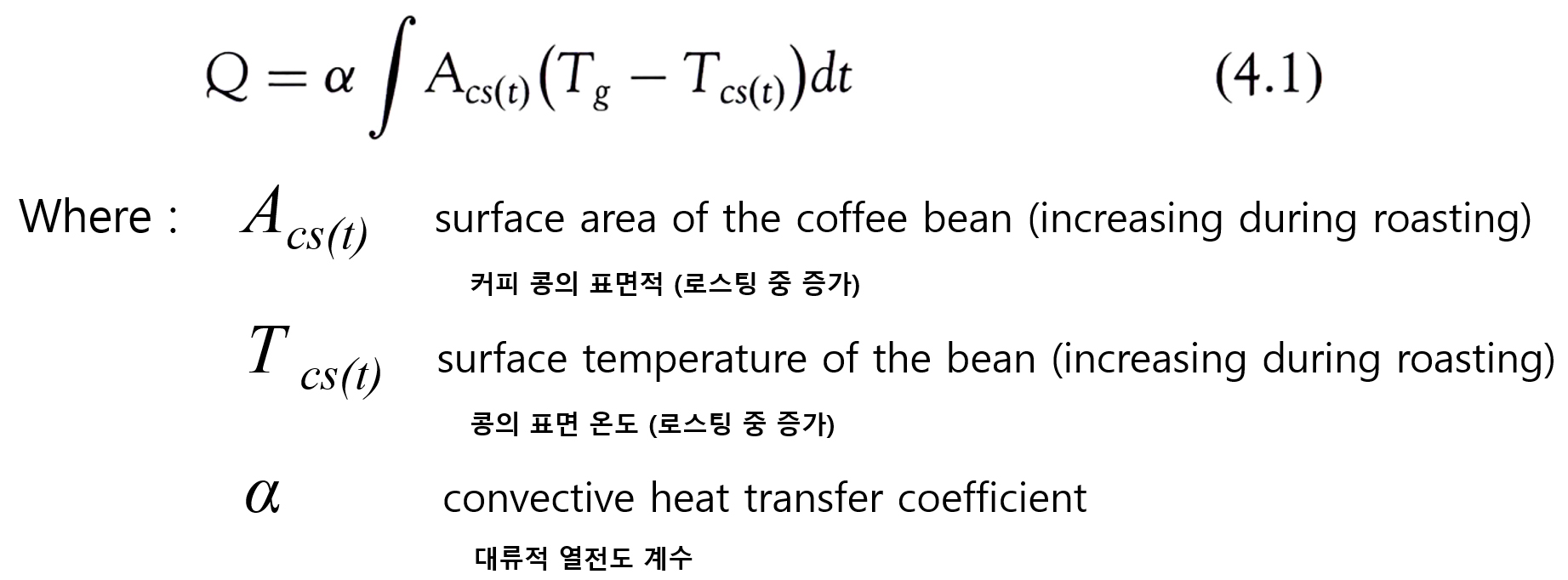 유동화하는 기체들(fluidizing gases)을 사용하는 로스팅의 이점이 등식 4.1에서 분명해진다. - 유동화된 콩들의 Surface area (표면적) Acs 는
