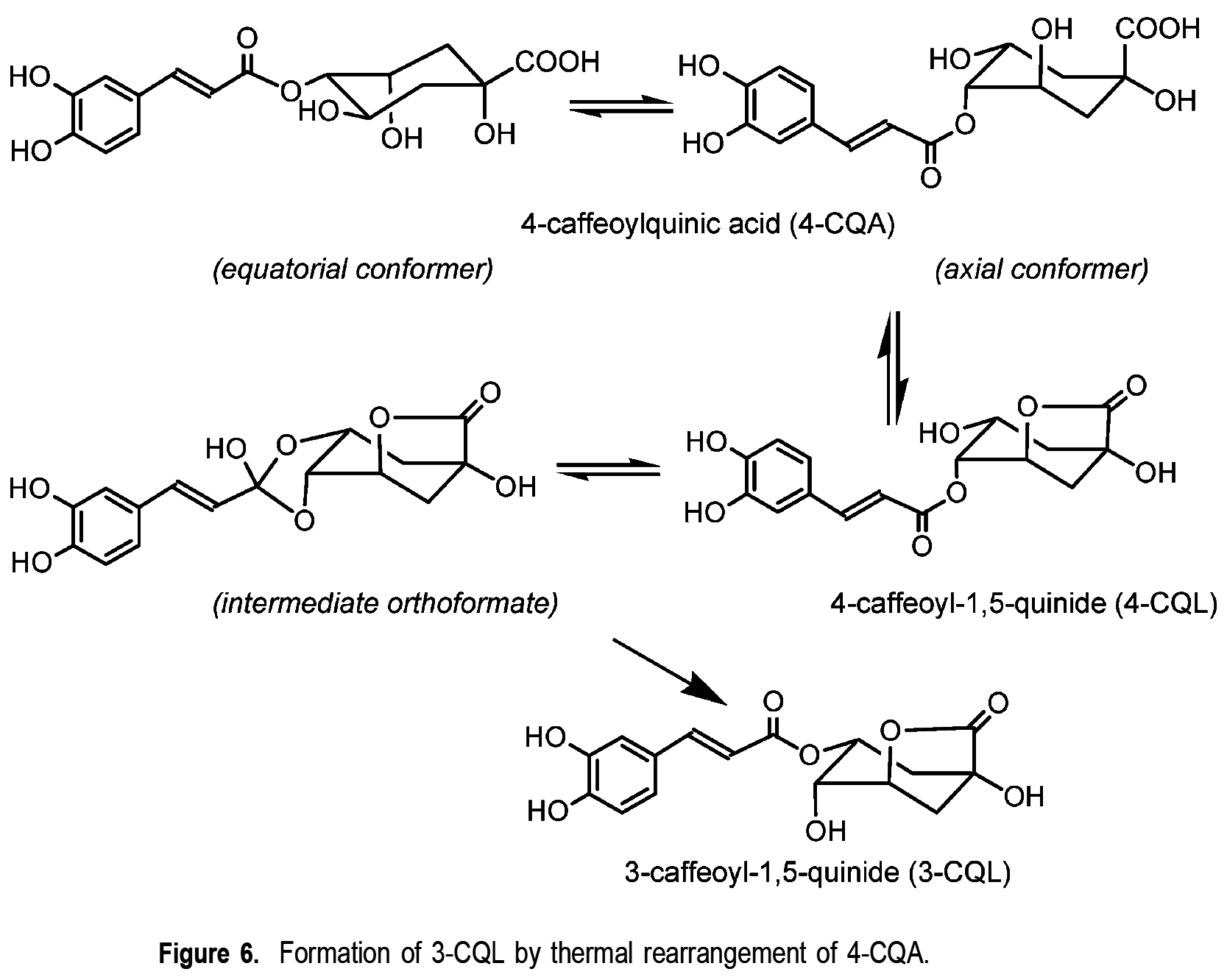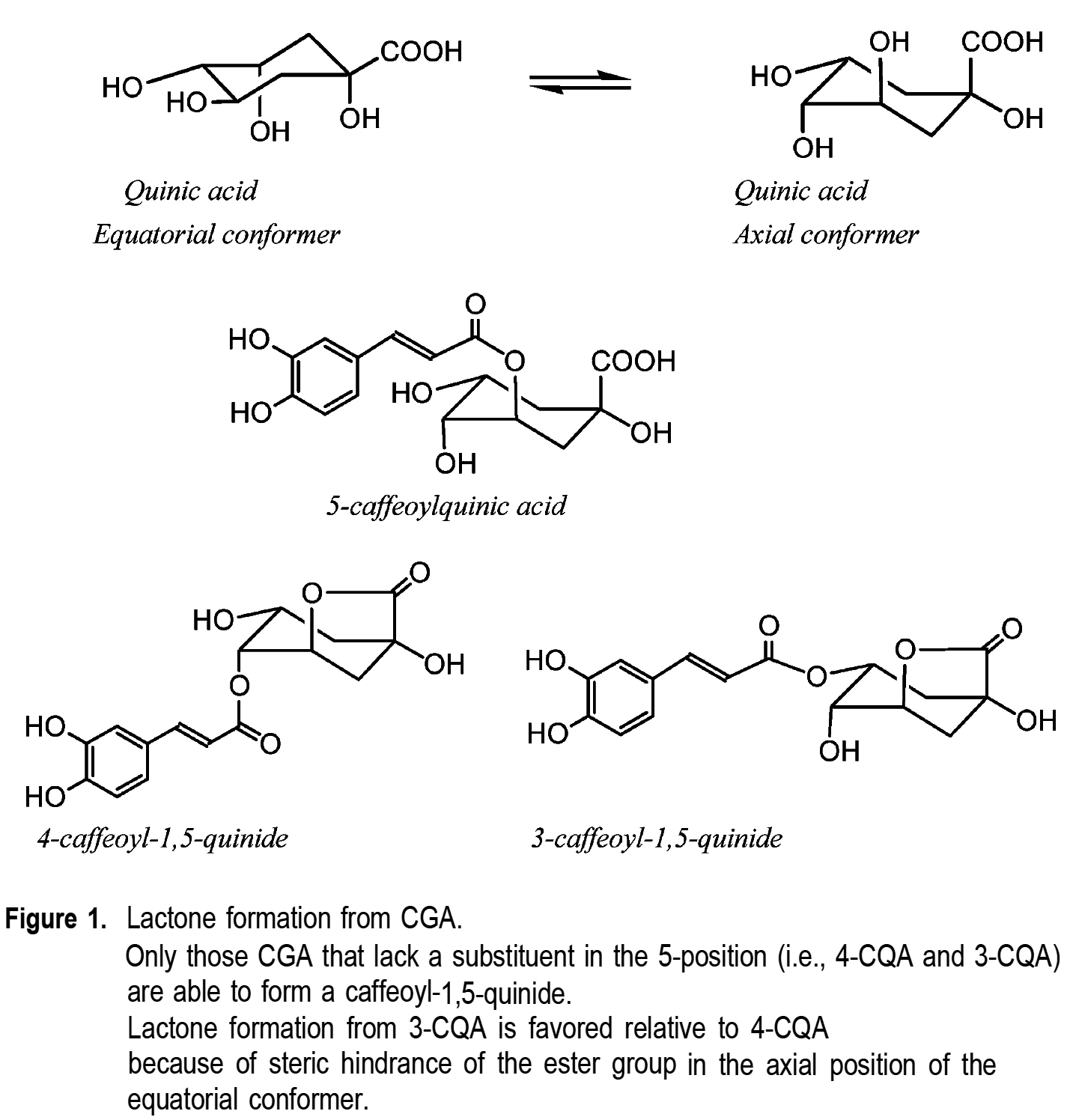 5번 위치에 치환기가 없는 CGA들만 (즉, 4-CQA와 3-CQA) 카페욜-1,5-퀴나드를 형성할 수 있다.
