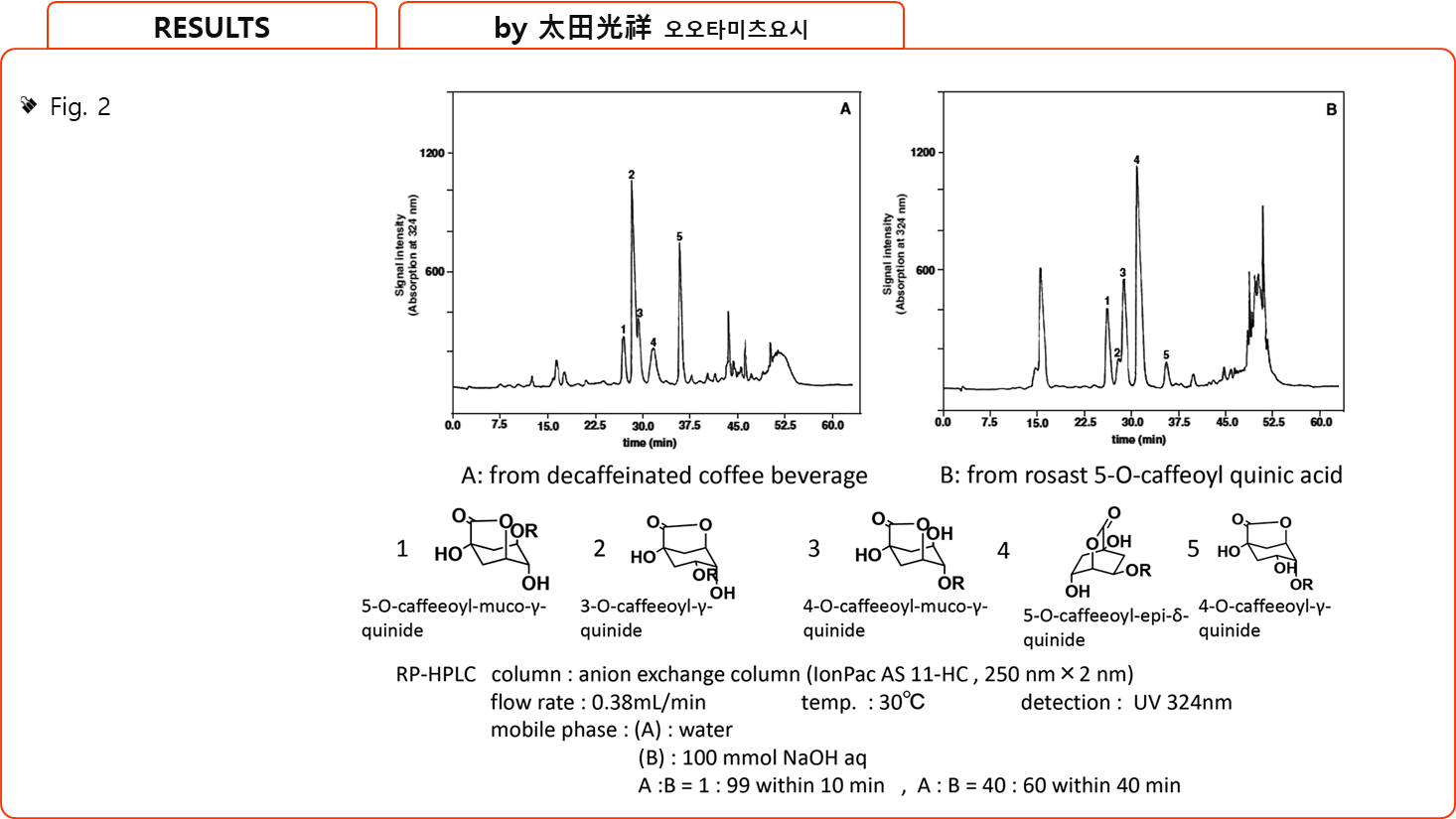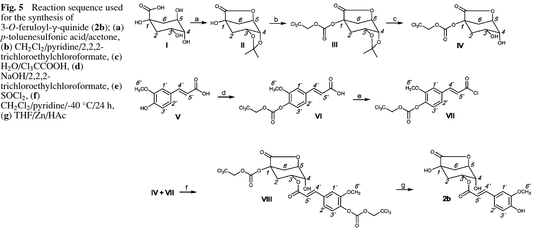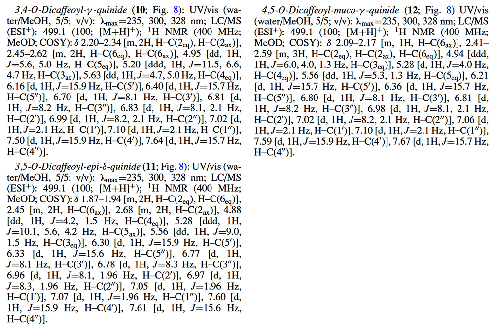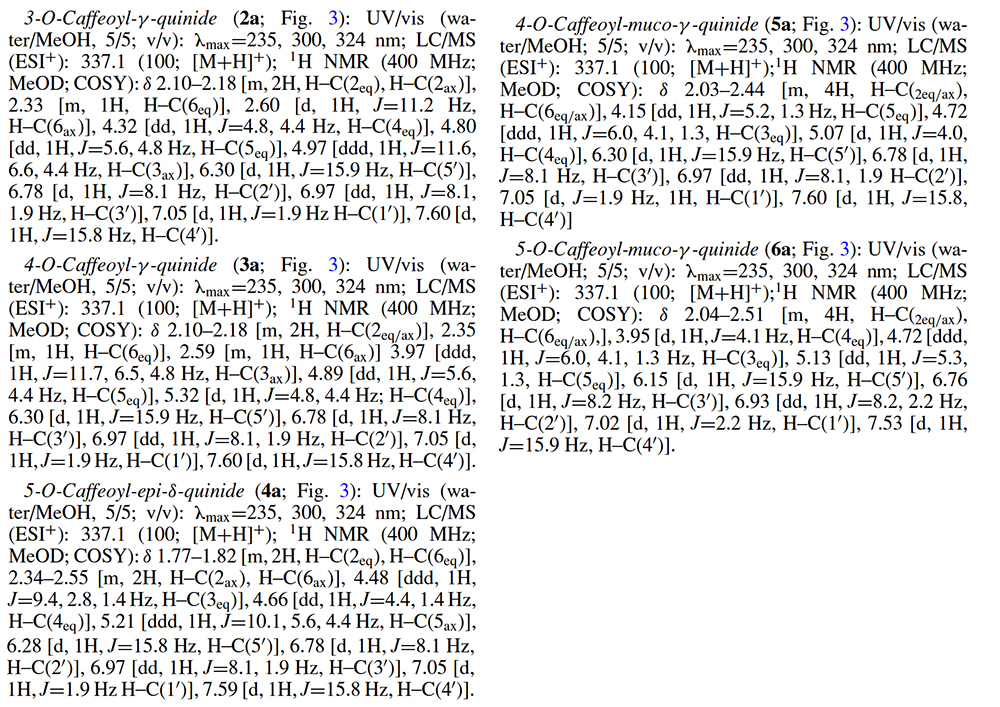 1H 커플링 패턴은 4-O-caffeoyl- and 5-O-caffeoyl-muco-γ-quinide대해 얻은 데이터와 동일했다. - 1H NMR과 COSY spectroscopy로 관찰된 모든 화학적 이동(chemical shifts)과 coupling constants를