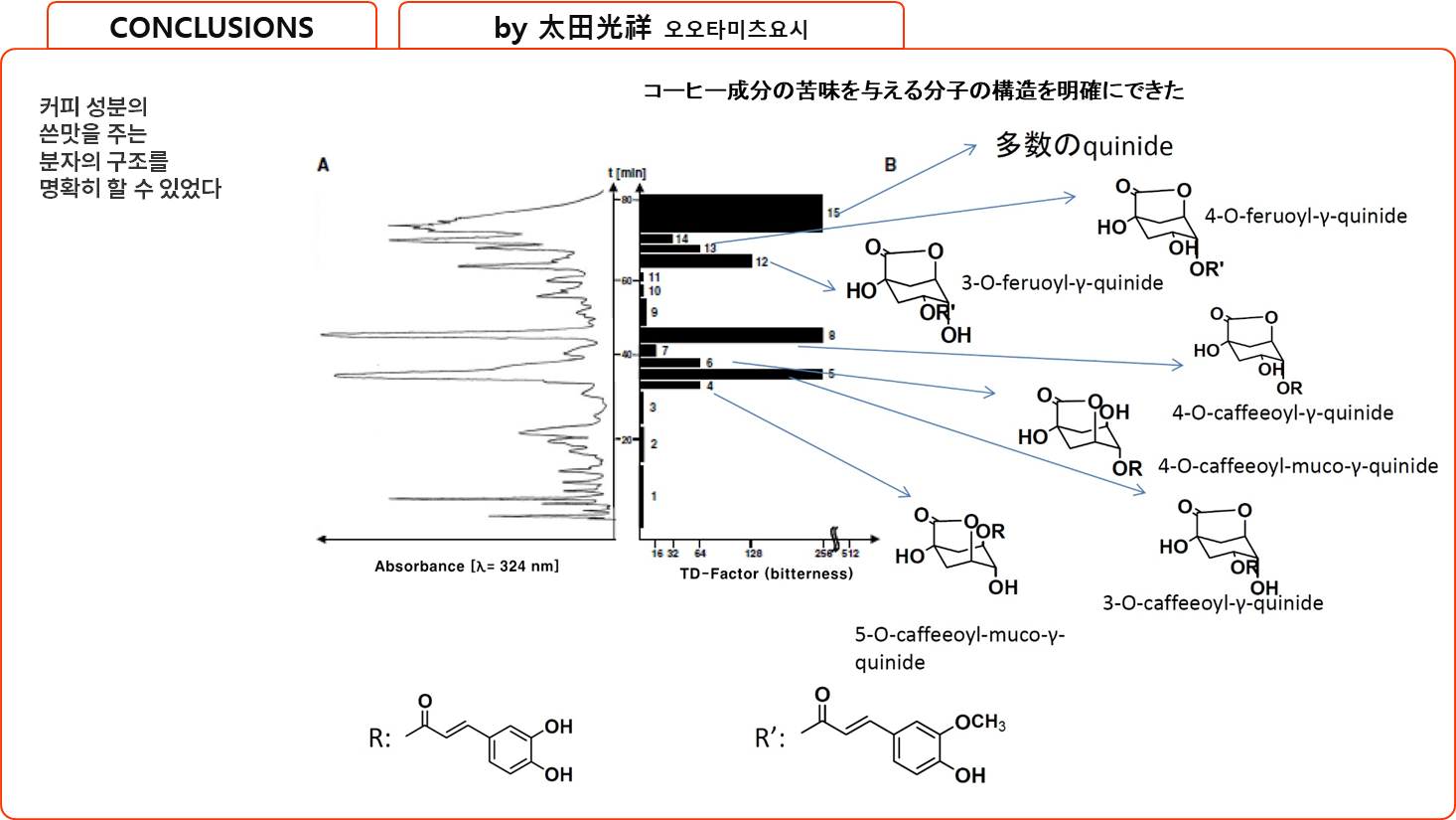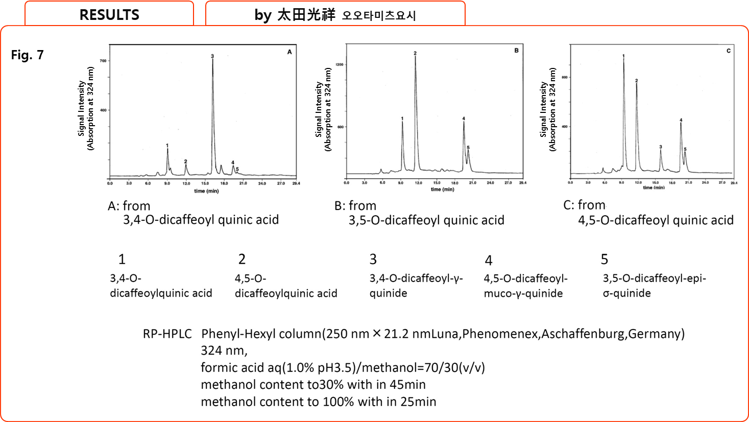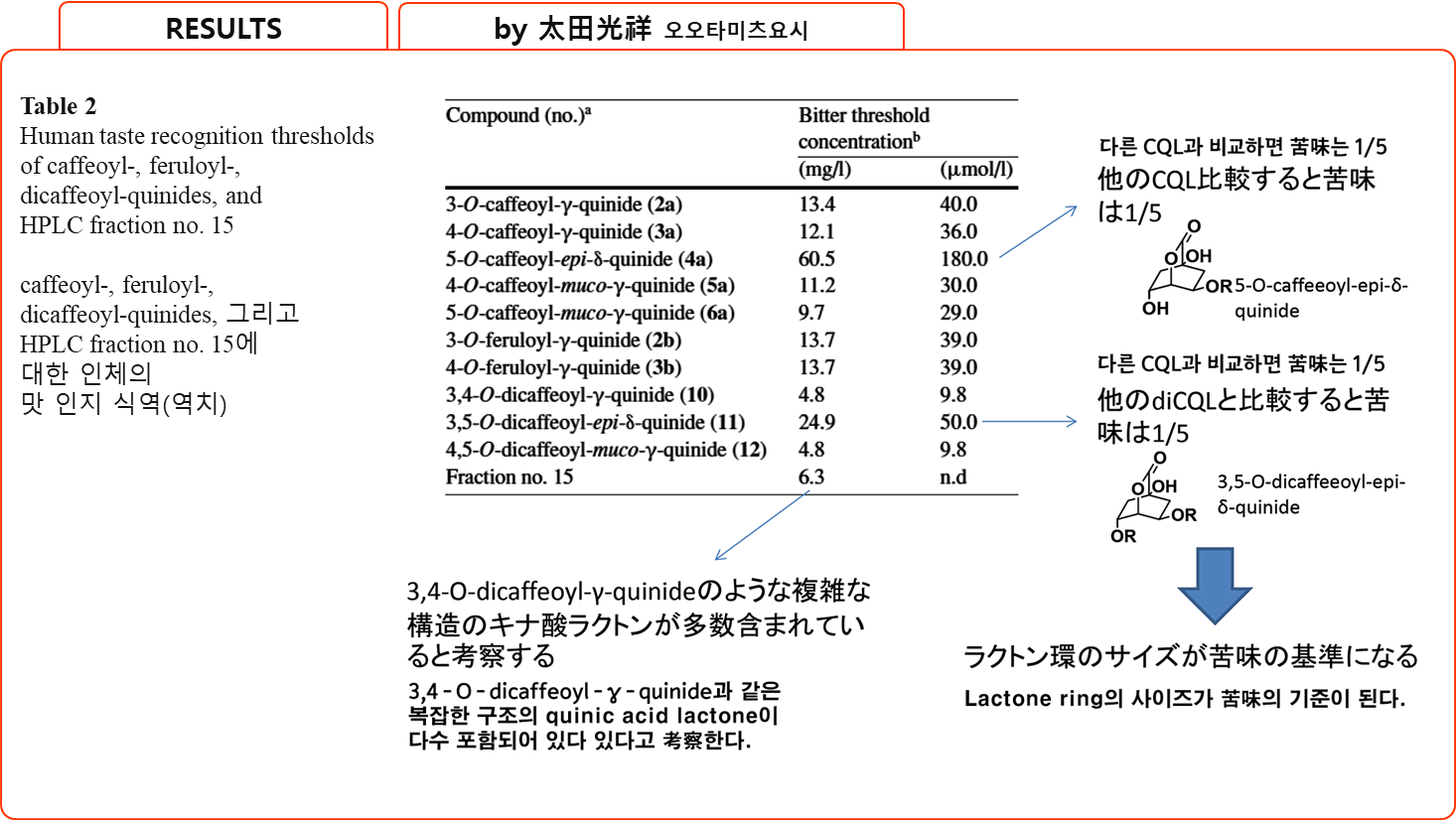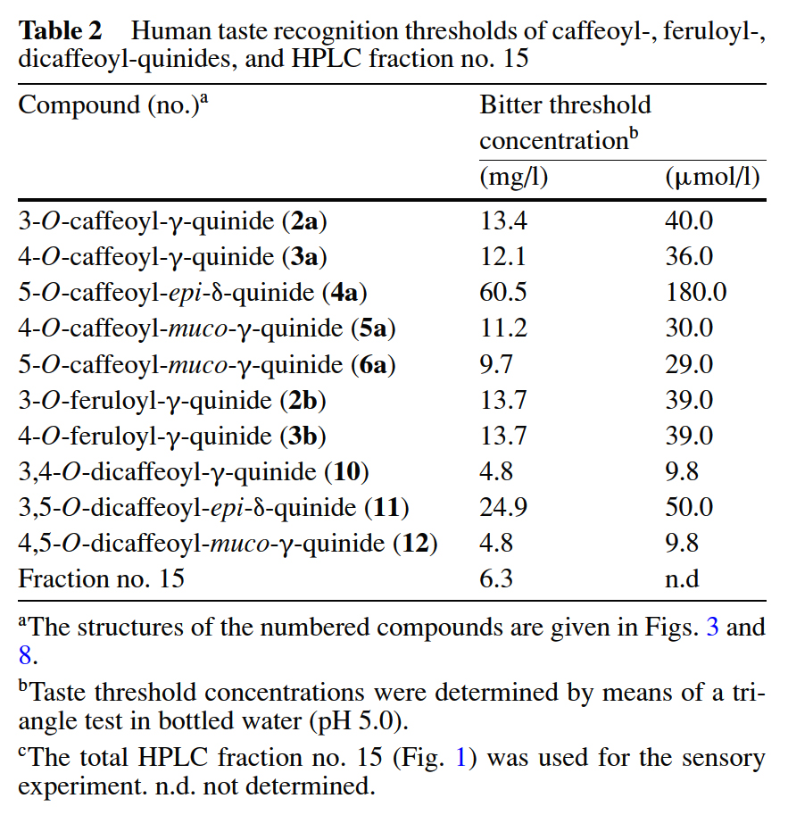 해당 3-feruoyl- (2b) and 4-feruloyl-γ-quinides (3b)는 39 μmol/l로 다소 높은 쓴맛 검출 역치를 나타냈다. - 3,4-O-dicaffeoyl-γ-quinide 및 4,5-O-dicaffeoyl-muco-γ-quinide의 쓴맛 역치(9.8 μmol/l)가