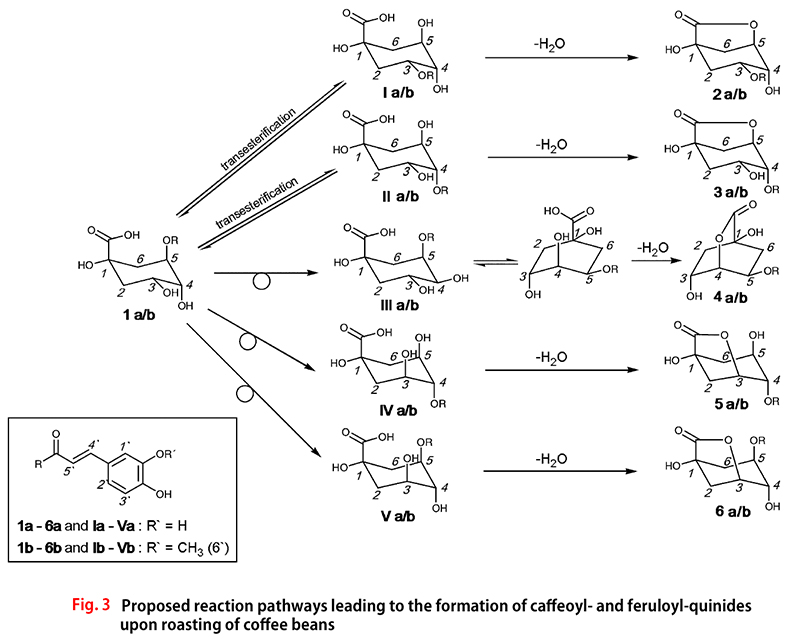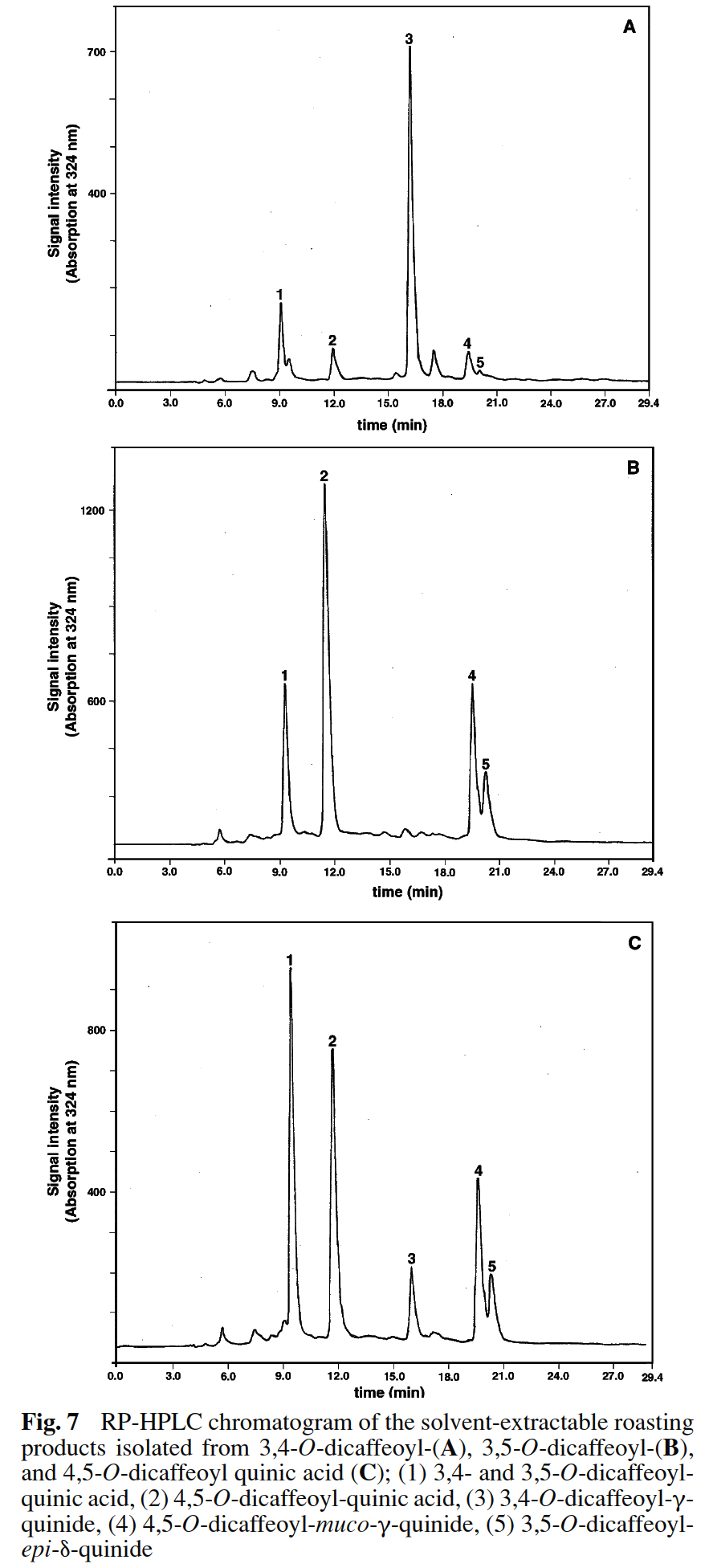 커피 로스팅 시 개별 dicaffeoyl-quinides가 형성될 수 있다. - 열처리 중에, 그 개별 dicaffeoyl-quinides는 트랜스에스테르화 반응으로 서로 변환된다.