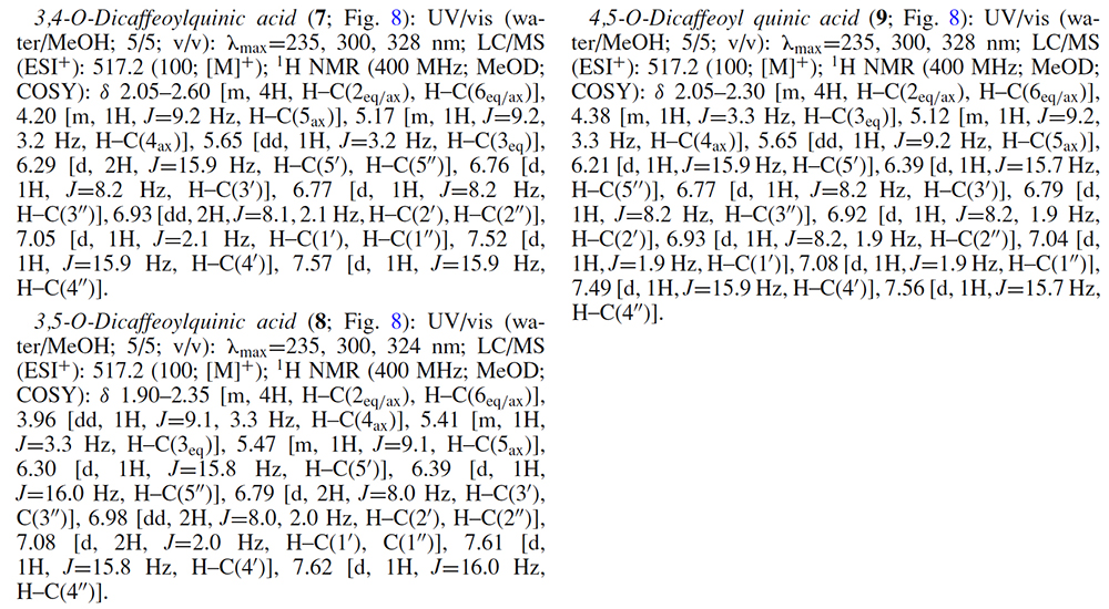 성공적으로 분리되었다 (Fig. 7B 및 C). - 피크 5의 1H NMR 스펙트럼(Fig. 7A-C)은 5-caffeoyl-epi-δ-quinide의 NMR 데이터와 비교하여