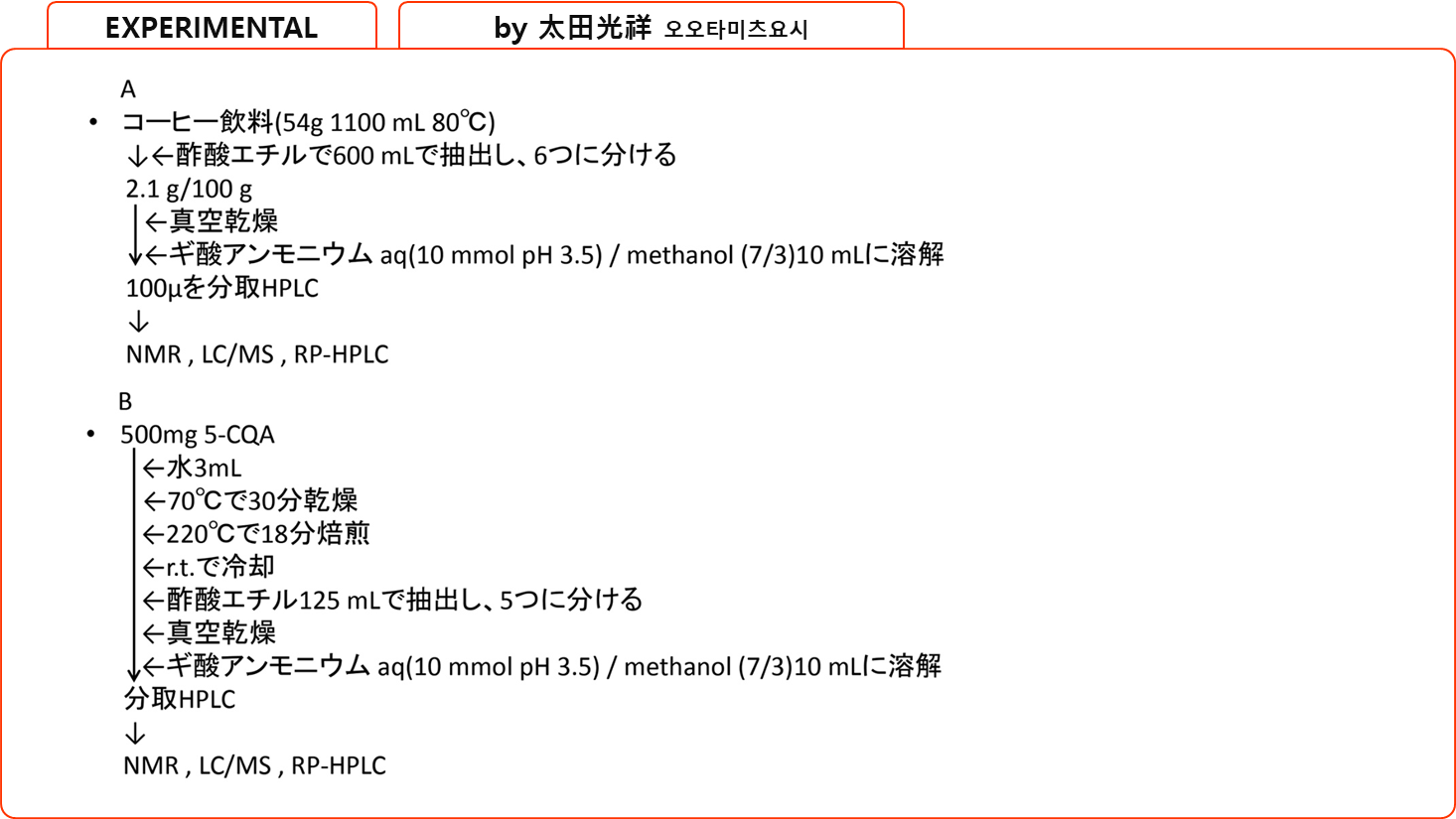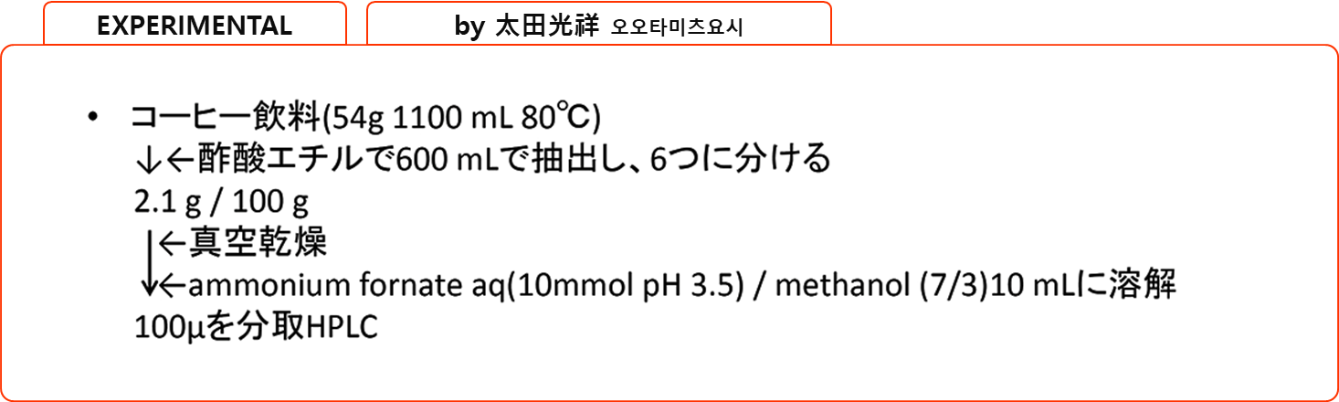 커피 음료(250ml)를 펜탄(pentane)(3×100 ml), 에틸 아세테이트(ethyl acetate)(6×100 ml), 클로로포름(chloroform)(3×100 ml)으로 순차적으로 추출했다.