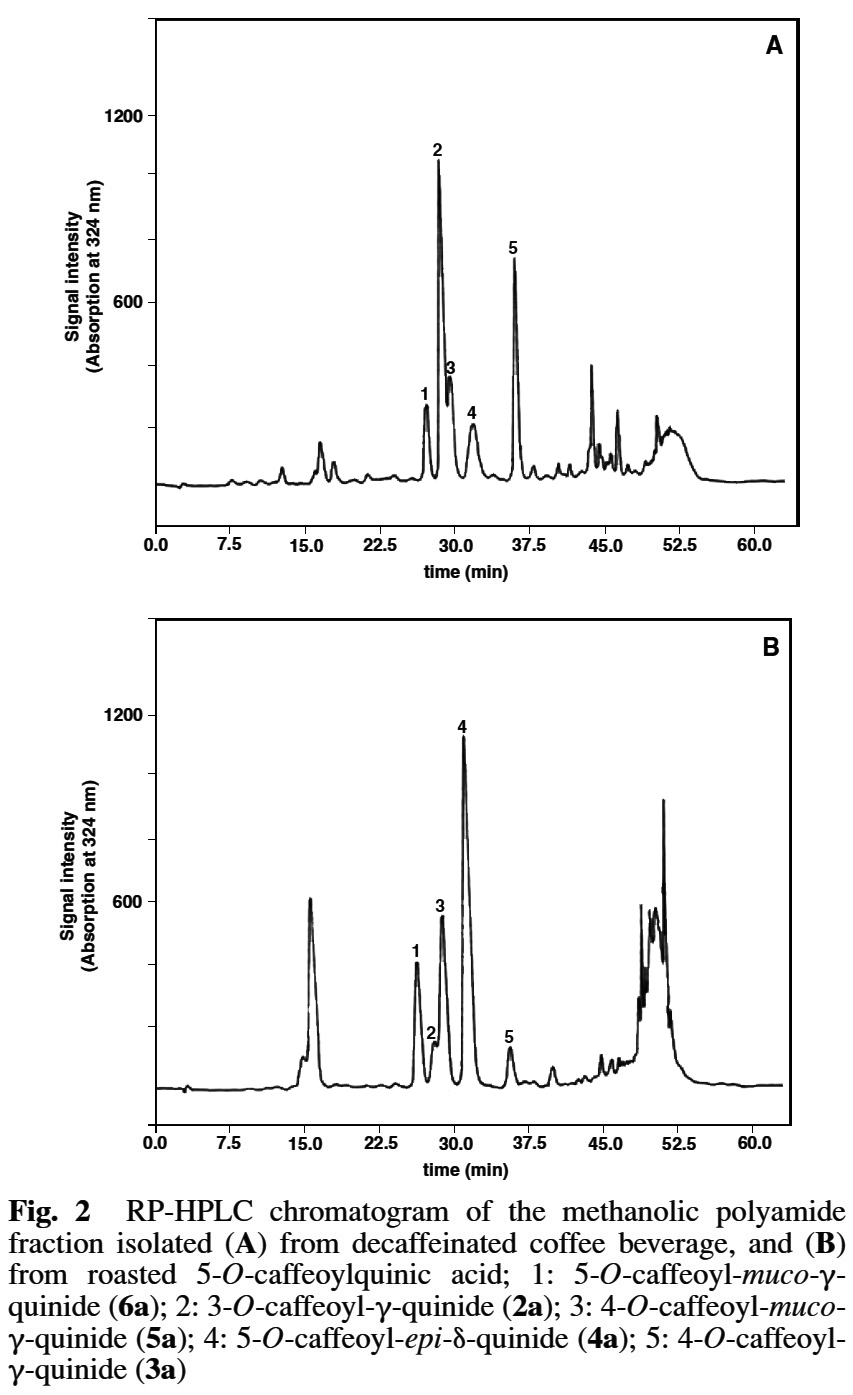 5-O-caffeoyl-muco-γ-quinide와 같은 5원환 락톤에 비해 6배 더 높은 역치 농도를 나타냈다 (Table 2). - caffeoyl-γ-quinides에 비해,