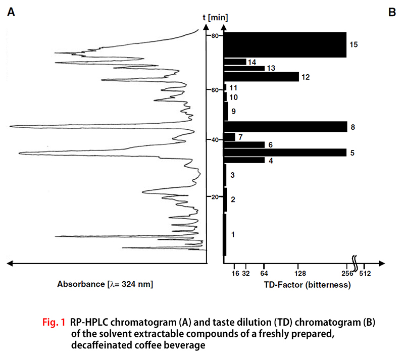 20여 년 전, Chen [4]이 수행한 최초 연구에서는 생두에 이미 존재하는 알칼로이드인 카페인(caffeine)과 트리고넬린(trigonelline)이 커피 음료의 전반적인 쓴맛에 각각 최대 10~30%와 1%를 차지하는 것으로 밝혀졌다. 저자는 특히 콩 로스팅 중 맛이 없는 전구체에서 생성된 로스팅 화합물이 커피 추출액의 쓴맛을 유발하는 주요 요인이라고 제안했다.