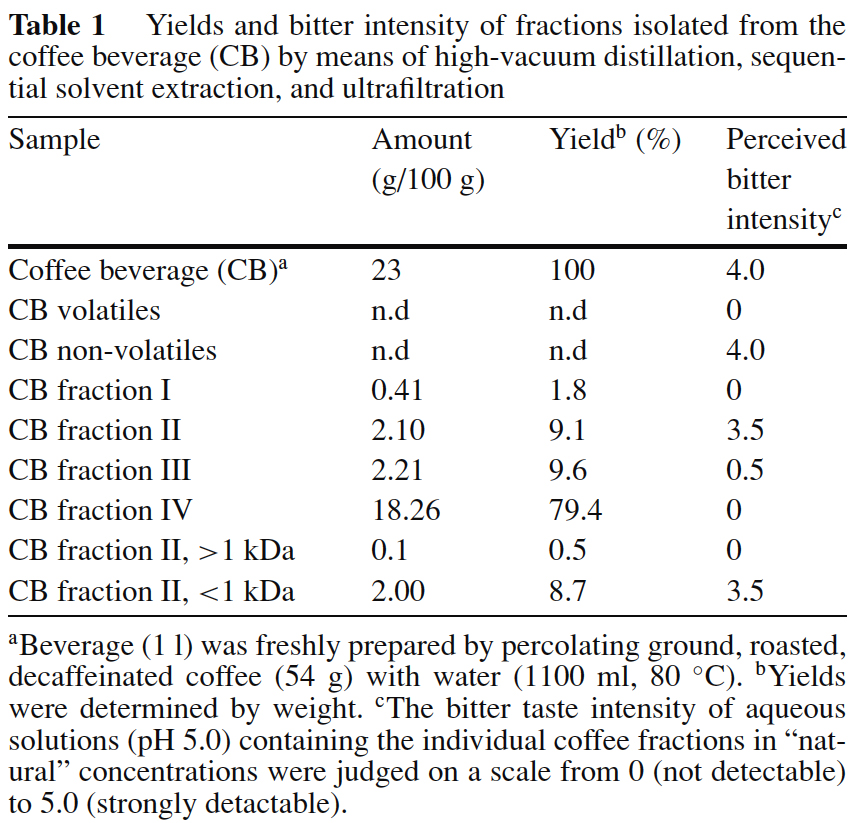 지금까지 문헌에 보고된 이러한 데이터는 다소 모순적이기 때문에, 로스트 커피의 주요 쓴맛 미각 물질의 분자적 특성은 아직 불분명하다고 결론지어야 한다.