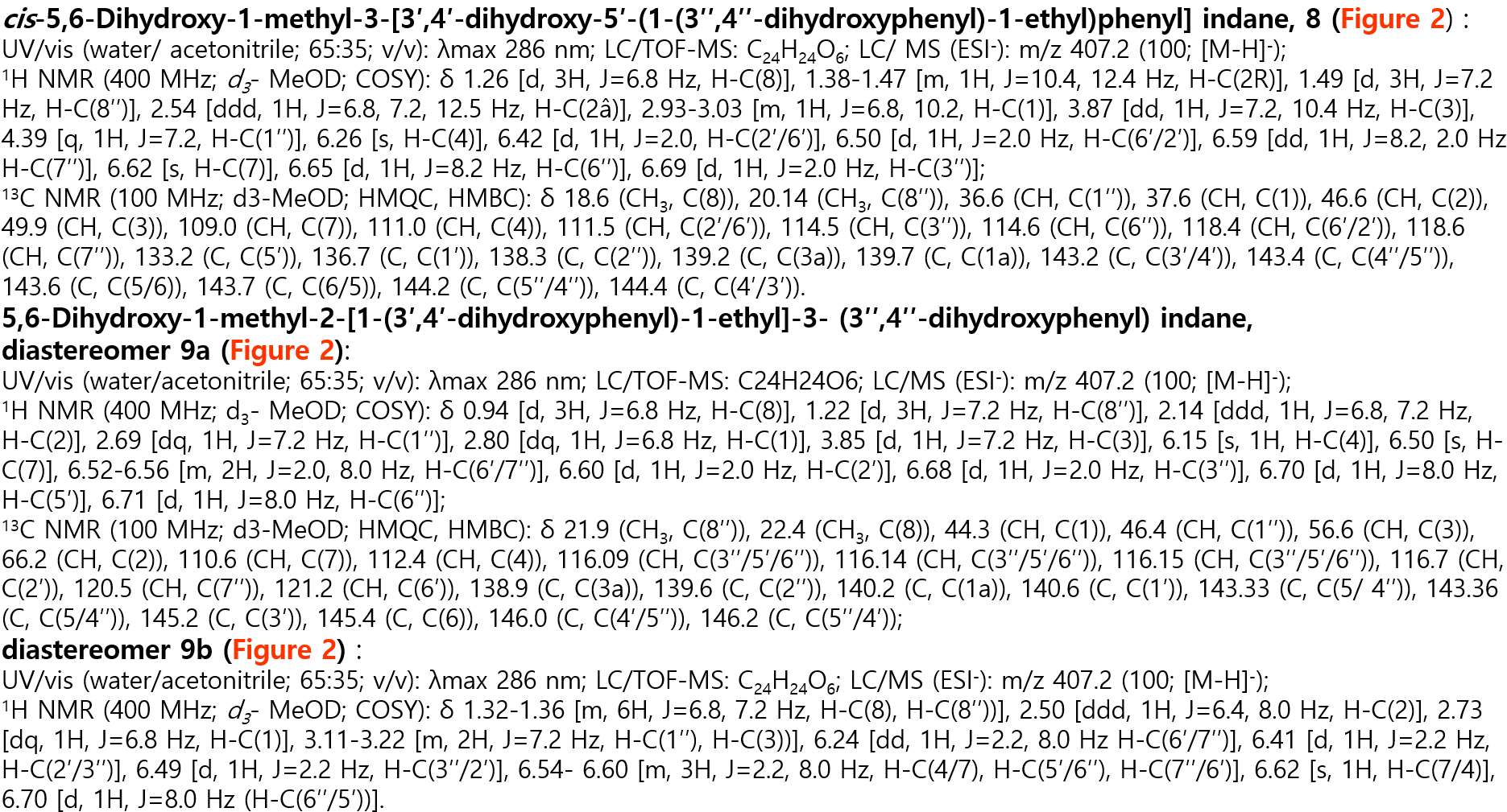 각각 phenylindanes 1, 2, 5, and 6을 각각 유발한다. - 이들 쓴맛 나는 4-vinylcatechol dimers로부터 시작하여,