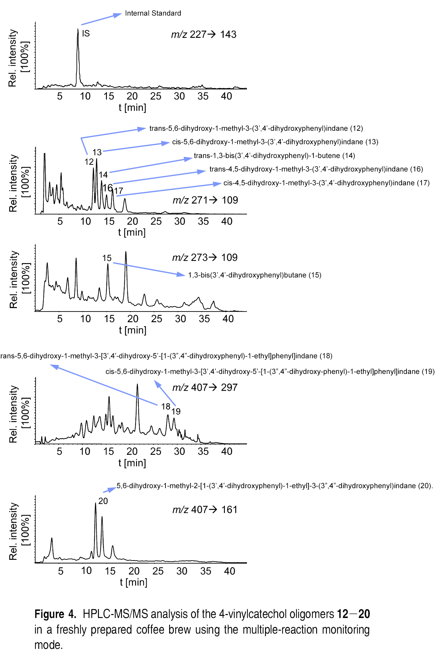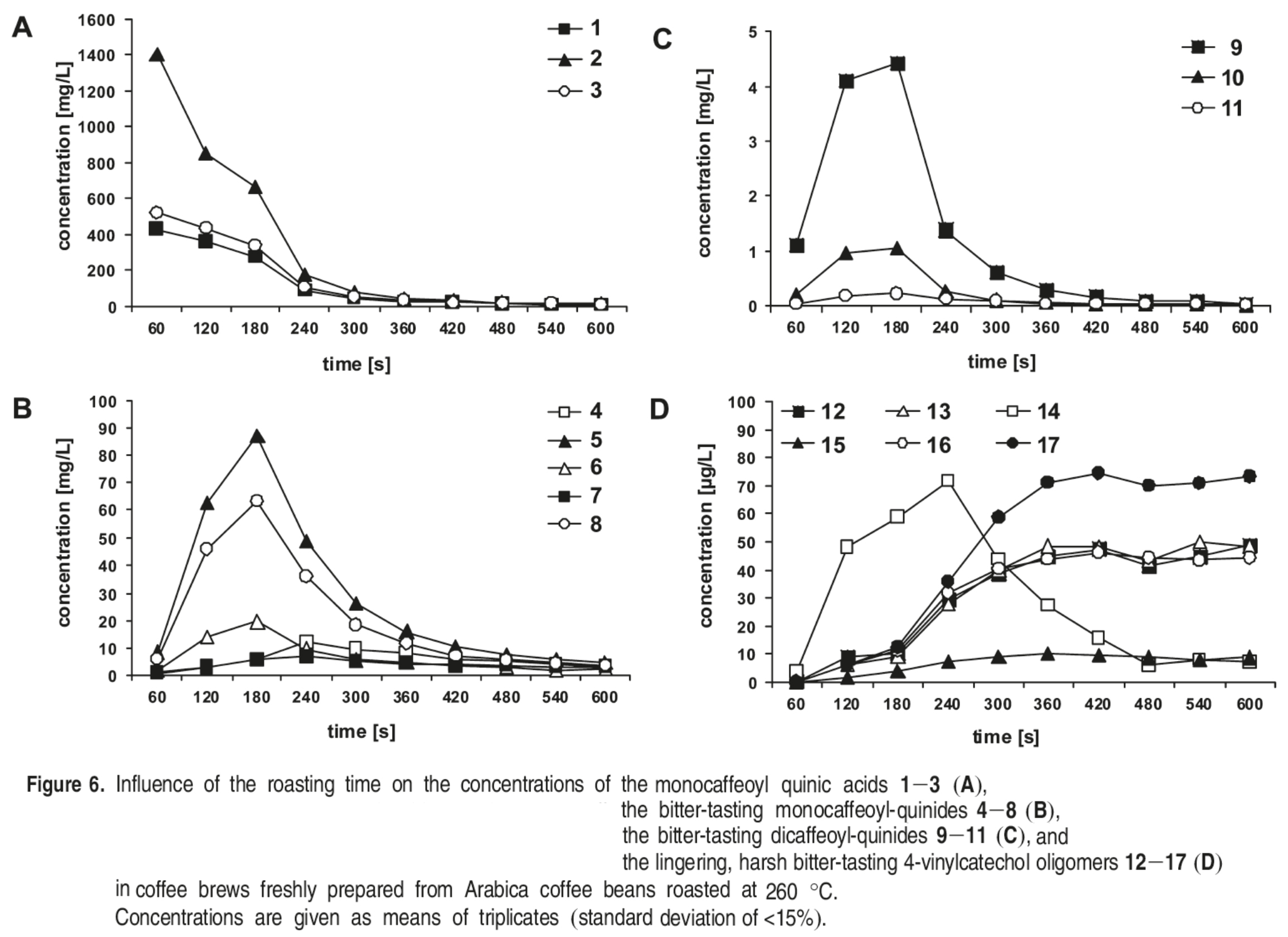 ⇒ 따라서 분쇄 커피로부터의 이 부류의 bitter lactones의 다소 덜 효과적인 발산을 보여준다. - Harsh bitter-tasting 4-vinylcatechol oligomers 12-17의 quantitative analysis 결과