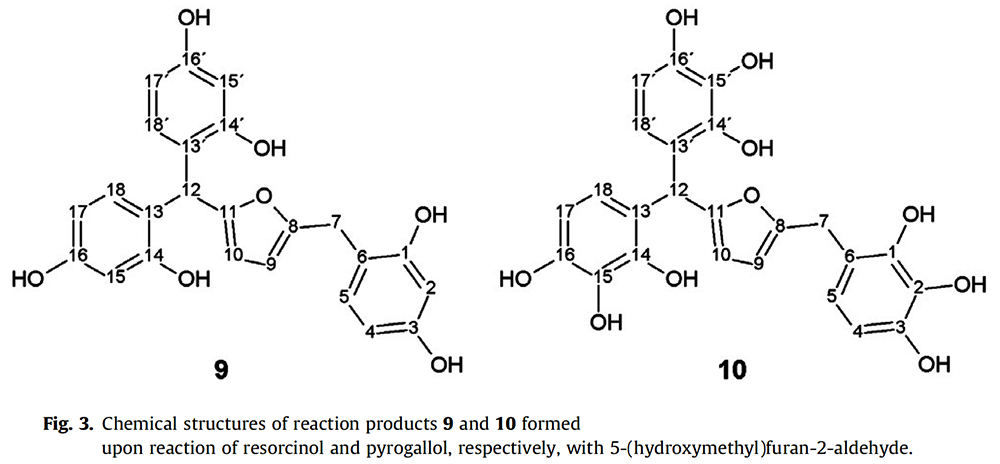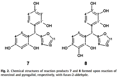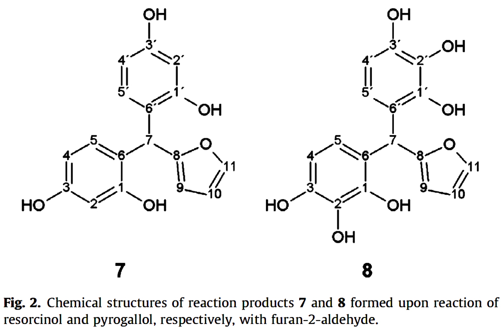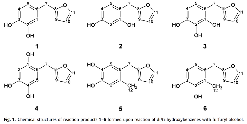 ⇒ 그 반응 산물들은 (furan-2-yl)methylated benzene diols and triols인 것으로 식별되었고,